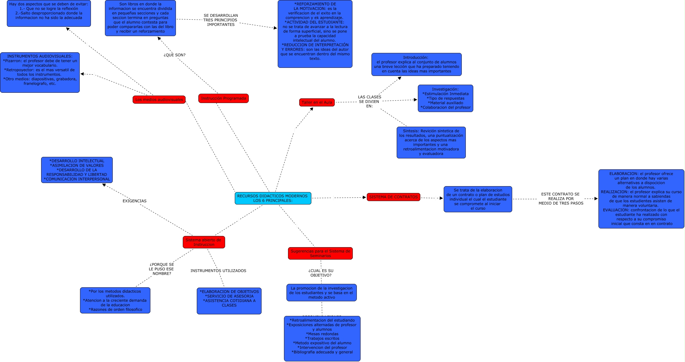 Este Cmap, tiene información relacionada con: recursos didacticos, Taller en el Aula LAS CLASES SE DIVIEN EN: Investigación: *Estimulación Inmediata *Tipo de respuestas *Material auxiliado *Colaboracion del profesor, Taller en el Aula LAS CLASES SE DIVIEN EN: Sintesis: Revición sintetica de los resultados, una puntualización acerca de los aspectos mas importantes y una retroalimentacion motivadora y evaluadora, RECURSOS DIDACTICOS MODERNOS LOS 6 PRINCIPALES: Sugerencias para el Sistema de Seminarios, Los medios audiovisuales RECURSOS DIDACTICOS MODERNOS LOS 6 PRINCIPALES:, Los medios audiovisuales Hay dos aspectos que se deben de evitar: 1.- Que no se logre la reflexión 2.-Salto desproporcionado donde la informacion no ha sido la adecuada, RECURSOS DIDACTICOS MODERNOS LOS 6 PRINCIPALES: Taller en el Aula, Sugerencias para el Sistema de Seminarios ¿CUAL ES SU OBJETIVO? La promocion de la investigacion de los estudiantes y se basa en el metodo activo, RECURSOS DIDACTICOS MODERNOS LOS 6 PRINCIPALES: Instrucción Programada, RECURSOS DIDACTICOS MODERNOS LOS 6 PRINCIPALES: Sistema abierto de Instruccion, RECURSOS DIDACTICOS MODERNOS LOS 6 PRINCIPALES: SISTEMA DE CONTRATOS, La promocion de la investigacion de los estudiantes y se basa en el metodo activo RECOMENDACIONES *Retroalimentacion del estudiando *Exposiciones alternadas de profesor y alumnos *Mesas redondas *Trabajos escritos *Metodo expositivo del alumno *Intervencion del profesor *Bibliografia adecuada y general, Los medios audiovisuales INSTRUMENTOS AUDIOVISUALES: *Pizarron: el profesor debe de tener un mejor vocabulario. *Retropoyector: es el mas versatil de todos los instrumentos. *Otro medios: diapositivas, grabadora, franelografo, etc., Instrucción Programada ¿QUE SON? Son libros en donde la informacion se encuentra dividida en pequeñas secciones y cada seccion termina en preguntas que el alumno contesta para poder compararlas con las del libro y recibir un reforzamiento, Sistema abierto de Instruccion INSTRUMENTOS UTILIZADOS *ELABORACION DE OBJETIVOS *SERVICIO DE ASESORIA *ASISTENCIA COTIDIANA A CLASES, Sistema abierto de Instruccion EXIGENCIAS *DESARROLLO INTELECTUAL *ASIMILACION DE VALORES *DESARROLLO DE LA RESPONSABILIDAD Y LIBERTAD *COMUNICACION INTERPERSONAL, Sistema abierto de Instruccion ¿PORQUE SE LE PUSO ESE NOMBRE? *Por los metodos didacticos utilizados. *Atencion a la creciente demanda de la educacion *Razones de orden filosofico, SISTEMA DE CONTRATOS Se trata de la elaboracion de un contrato o plan de estudios individual el cual el estudiante se compromete al iniciar el curso, Son libros en donde la informacion se encuentra dividida en pequeñas secciones y cada seccion termina en preguntas que el alumno contesta para poder compararlas con las del libro y recibir un reforzamiento SE DESARROLLAN TRES PRINCIPIOS IMPORTANTES *REFORZAMIENTO DE LA MOTIVACION: es la verificacion de el exito en la comprencion y ek aprendizaje. *ACTIVIDAD DEL ESTUDIANTE: no se trata de avanzar a la lectura de forma superficial, sino se pone a prueba la capacidad intelectual del alumno. *REDUCCION DE INTERPRETACIÓN Y ERRORES: son las ideas del autor que se encuentran dentro del mismo texto., Taller en el Aula LAS CLASES SE DIVIEN EN: Introducción: el profesor explica al conjunto de alumnos una breve lección que ha preparado teniendo en cuenta las ideas mas importantes, Se trata de la elaboracion de un contrato o plan de estudios individual el cual el estudiante se compromete al iniciar el curso ESTE CONTRATO SE REALIZA POR MEDIO DE TRES PASOS ELABORACION: el profesor ofrece un plan en donde hay varias alternativas a dispocicion de los alumnos. REALIZACION: el profesor explica su curso de manera normal a sabiendas de que los estudientes asisten de manera voluntaria. EVALUACION: confrontacion de lo que el estudiante ha realizado con respecto a su compromiso inicial que consta en en contrato
