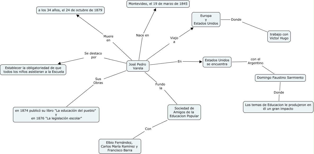 Este Cmap, tiene información relacionada con: José Pedro Varela EXPO, José Pedro Varela En Estados Unidos se encuentra, Sociedad de Amigos de la Educacion Popular Con Elbio Fernández, Carlos María Ramírez y Francisco Barra, Europa y Estados Unidos Donde trabajo con Victor Hugo, José Pedro Varela Se destaco por Establecer la obligatoriedad de que todos los niños asistieran a la Escuela, José Pedro Varela Fundo la Sociedad de Amigos de la Educacion Popular, José Pedro Varela Viajo a Europa y Estados Unidos, Domingo Faustino Sarmiento Donde Los temas de Educacion le produjeron en él un gran impacto, Estados Unidos se encuentra con el Argentino Domingo Faustino Sarmiento, José Pedro Varela Muere en a los 34 años, el 24 de octubre de 1879, José Pedro Varela Nace en Montevideo, el 19 de marzo de 1845, José Pedro Varela Sus Obras en 1874 publicó su libro "La educación del pueblo" y en 1876 "La legislación escolar"