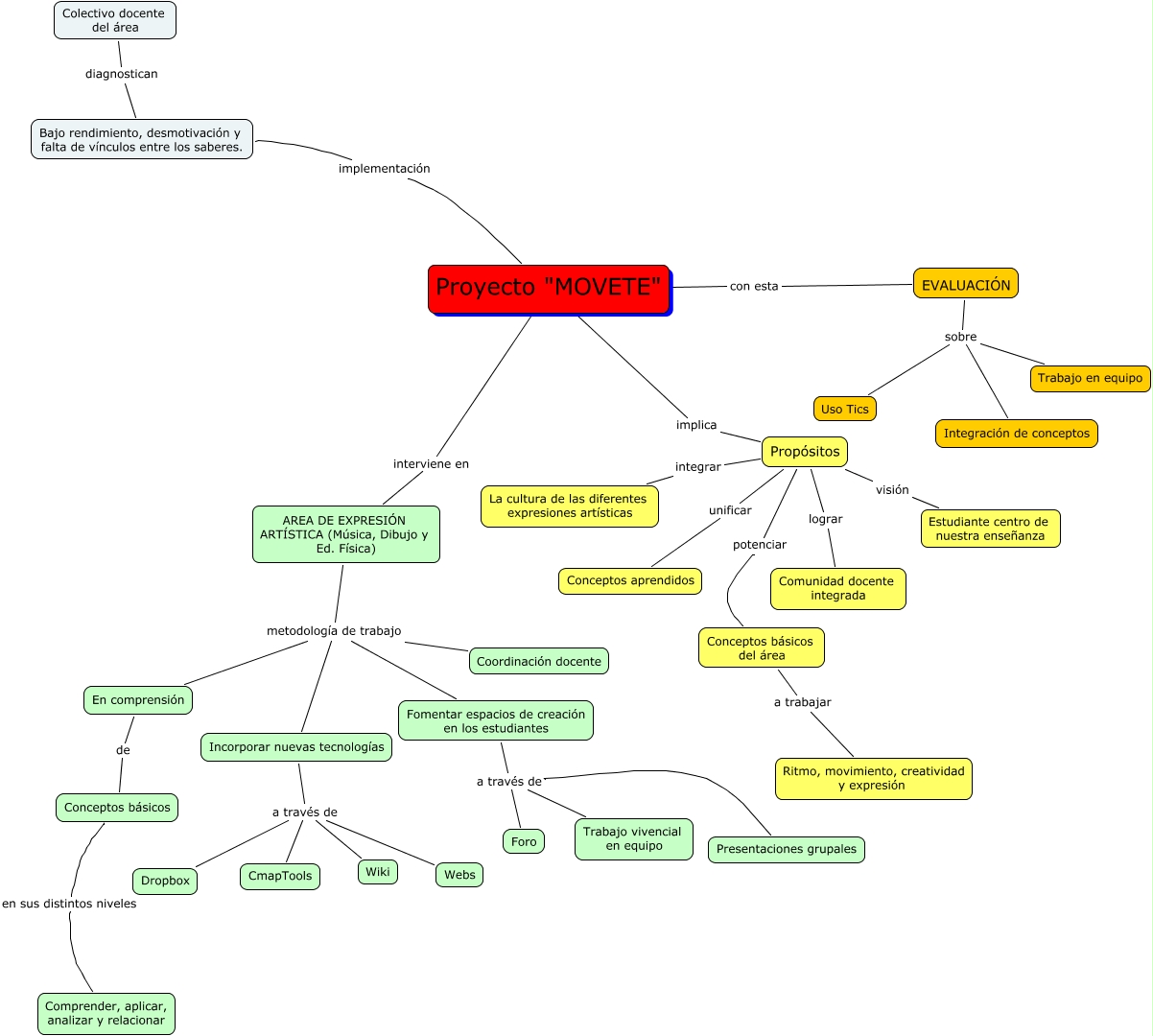 Este Cmap, tiene información relacionada con: Proyecto MOVETE, Proyecto "MOVETE" implica Propósitos, Colectivo docente del área diagnostican Bajo rendimiento, desmotivación y falta de vínculos entre los saberes., EVALUACIÓN sobre Integración de conceptos, Propósitos unificar Conceptos aprendidos, Propósitos visión Estudiante centro de nuestra enseñanza, Bajo rendimiento, desmotivación y falta de vínculos entre los saberes. implementación Proyecto "MOVETE", Incorporar nuevas tecnologías a través de Wiki, AREA DE EXPRESIÓN ARTÍSTICA (Música, Dibujo y Ed. Física) metodología de trabajo Incorporar nuevas tecnologías, Proyecto "MOVETE" con esta EVALUACIÓN, EVALUACIÓN sobre Uso Tics, AREA DE EXPRESIÓN ARTÍSTICA (Música, Dibujo y Ed. Física) metodología de trabajo Coordinación docente, Fomentar espacios de creación en los estudiantes a través de Trabajo vivencial en equipo, AREA DE EXPRESIÓN ARTÍSTICA (Música, Dibujo y Ed. Física) metodología de trabajo En comprensión, Conceptos básicos en sus distintos niveles Comprender, aplicar, analizar y relacionar, Fomentar espacios de creación en los estudiantes a través de Presentaciones grupales, Incorporar nuevas tecnologías a través de Dropbox, Incorporar nuevas tecnologías a través de Webs, Incorporar nuevas tecnologías a través de CmapTools, Propósitos potenciar Conceptos básicos del área, Conceptos básicos del área a trabajar Ritmo, movimiento, creatividad y expresión