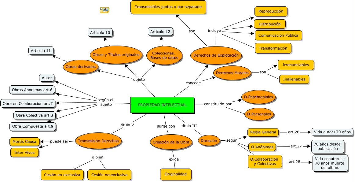 Este Cmap, tiene información relacionada con: Mapa conceptual 6 Propietat Intelectual, PROPIEDAD INTELECTUAL según el sujeto Obras Anónimas art.6, Derechos Morales son Irrenunciables, PROPIEDAD INTELECTUAL según el sujeto Obra Colectiva art.8, PROPIEDAD INTELECTUAL concede Derechos Morales, PROPIEDAD INTELECTUAL concede Derechos de Explotación, Duración según O.Anónimas, Derechos de Explotación incluye Reproducción, Obras derivadas Artículo 11, Duración según Regla General, PROPIEDAD INTELECTUAL surge con Creación de la Obra, Regla General art.26 Vida autor+70 años, Transmisión Derechos o bien Cesión en exclusiva, Transmisión Derechos puede ser Mortis Causa, PROPIEDAD INTELECTUAL título III Duración, PROPIEDAD INTELECTUAL objeto Colecciones. Bases de datos, Derechos de Explotación incluye Comunicación Pública, Derechos Morales son Inalienables, PROPIEDAD INTELECTUAL objeto Obras y Títulos originales, Obras y Títulos originales Artículo 10, PROPIEDAD INTELECTUAL título V Transmisión Derechos