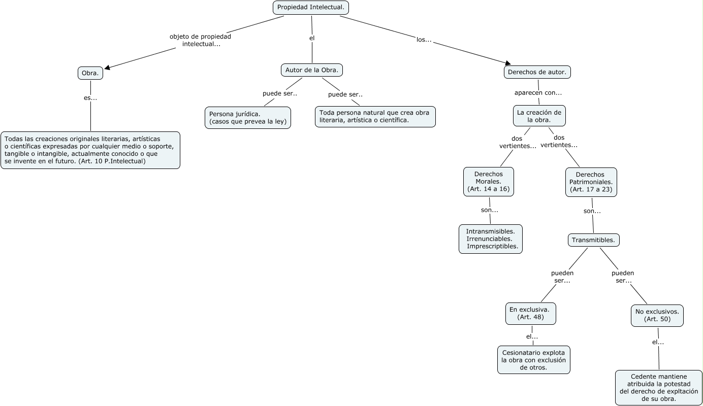 Este Cmap, tiene información relacionada con: Esnenari 10, 11, Propiedad Intelectual. el Autor de la Obra., Autor de la Obra. puede ser.. Toda persona natural que crea obra literaria, artística o científica., Derechos Morales. (Art. 14 a 16) son... Intransmisibles. Irrenunciables. Imprescriptibles., Derechos Patrimoniales. (Art. 17 a 23) son... Transmitibles., La creación de la obra. dos vertientes... Derechos Patrimoniales. (Art. 17 a 23), Obra. es... Todas las creaciones originales literarias, artísticas o científicas expresadas por cualquier medio o soporte, tangible o intangible, actualmente conocido o que se invente en el futuro. (Art. 10 P.Intelectual), La creación de la obra. dos vertientes... Derechos Morales. (Art. 14 a 16), No exclusivos. (Art. 50) el... Cedente mantiene atribuida la potestad del derecho de expltación de su obra., Autor de la Obra. puede ser.. Persona jurídica. (casos que prevea la ley), Transmitibles. pueden ser... No exclusivos. (Art. 50), Propiedad Intelectual. los... Derechos de autor., En exclusiva. (Art. 48) el... Cesionatario explota la obra con exclusión de otros., Derechos de autor. aparecen con... La creación de la obra., Transmitibles. pueden ser... En exclusiva. (Art. 48), Propiedad Intelectual. objeto de propiedad intelectual... Obra.