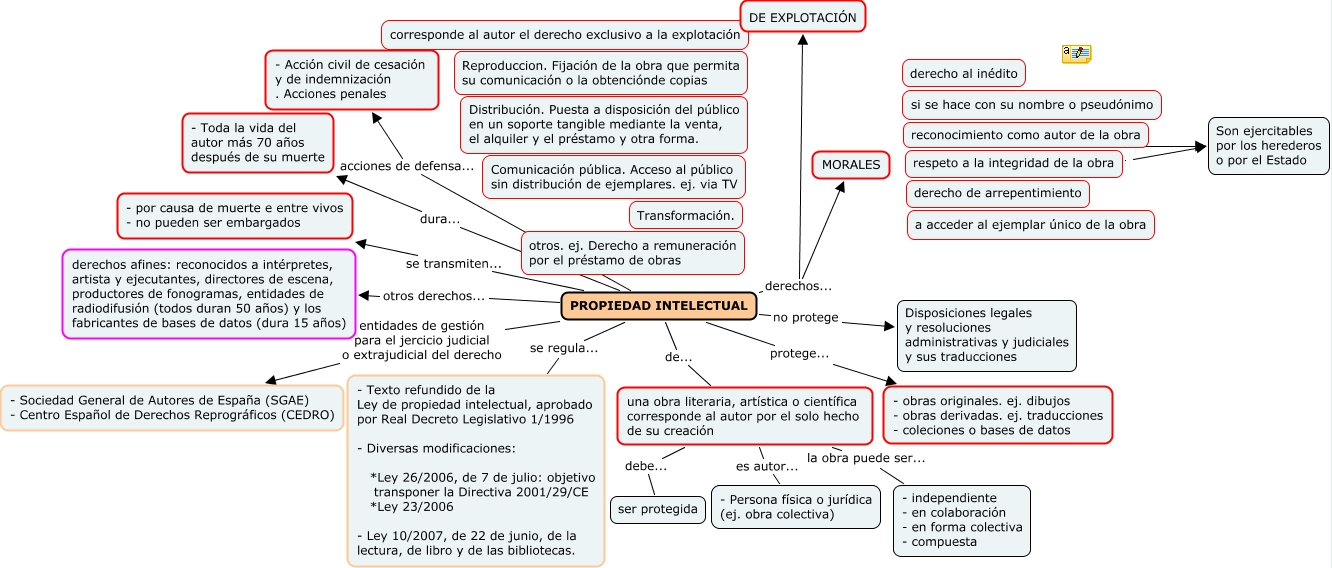 Este Cmap, tiene información relacionada con: Propiedad intelectual, respeto a la integridad de la obra ??, una obra literaria, artística o científica corresponde al autor por el solo hecho de su creación la obra puede ser... - independiente - en colaboración - en forma colectiva - compuesta, reconocimiento como autor de la obra Son ejercitables por los herederos o por el Estado, PROPIEDAD INTELECTUAL protege... - obras originales. ej. dibujos - obras derivadas. ej. traducciones - coleciones o bases de datos, PROPIEDAD INTELECTUAL se transmiten... - por causa de muerte e entre vivos - no pueden ser embargados, PROPIEDAD INTELECTUAL acciones de defensa... - Acción civil de cesación y de indemnización . Acciones penales, PROPIEDAD INTELECTUAL se regula... - Texto refundido de la Ley de propiedad intelectual, aprobado por Real Decreto Legislativo 1/1996 - Diversas modificaciones: *Ley 26/2006, de 7 de julio: objetivo transponer la Directiva 2001/29/CE *Ley 23/2006 - Ley 10/2007, de 22 de junio, de la lectura, de libro y de las bibliotecas., PROPIEDAD INTELECTUAL derechos... DE EXPLOTACIÓN, una obra literaria, artística o científica corresponde al autor por el solo hecho de su creación debe... ser protegida, PROPIEDAD INTELECTUAL otros derechos... derechos afines: reconocidos a intérpretes, artista y ejecutantes, directores de escena, productores de fonogramas, entidades de radiodifusión (todos duran 50 años) y los fabricantes de bases de datos (dura 15 años), una obra literaria, artística o científica corresponde al autor por el solo hecho de su creación es autor... - Persona física o jurídica (ej. obra colectiva), PROPIEDAD INTELECTUAL de... una obra literaria, artística o científica corresponde al autor por el solo hecho de su creación, PROPIEDAD INTELECTUAL derechos... MORALES, PROPIEDAD INTELECTUAL no protege Disposiciones legales y resoluciones administrativas y judiciales y sus traducciones, PROPIEDAD INTELECTUAL dura... - Toda la vida del autor más 70 años después de su muerte, PROPIEDAD INTELECTUAL entidades de gestión para el jercicio judicial o extrajudicial del derecho - Sociedad General de Autores de España (SGAE) - Centro Español de Derechos Reprográficos (CEDRO)