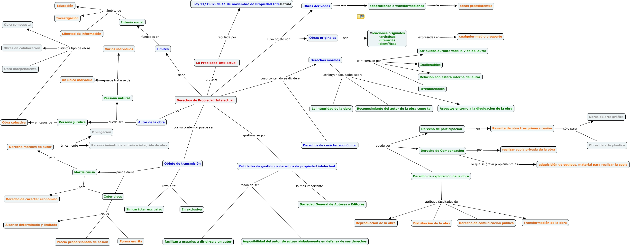 Este Cmap, tiene información relacionada con: mapa conceptual propiedad intelectual, Persona natural puede tratarse de Varios indivíduos, Derechos de carácter económico puede ser Derecho de Compensación, adaptaciones o transformaciones de obras preexistentes, Derechos de Propiedad Intelectual cuyo contenido se divide en Derechos morales, Inter vivos exige Forma escrita, Varios indivíduos distintos tipo de obras Obra independiente, Varios indivíduos distintos tipo de obras Obras en colaboración, Derecho de explotación de la obra atribuye facultades de Derecho de comunicación pública, Derechos de Propiedad Intelectual gestionarse por Entidades de gestión de derechos de propiedad intelectual, Derechos de Propiedad Intelectual cuyo contenido se divide en Derechos de carácter económico, Persona natural puede tratarse de Un único individuo, Derechos morales atribuyen facultades sobre Reconocimiento del autor de la obra como tal, Inter vivos exige Precio proporcionado de cesión, Derechos de Propiedad Intelectual por su contenido puede ser Objeto de transmisión, Mortis causa para Derecho morales de autor, Inter vivos exige Alcance determinado y limitado, Derechos morales caracterizan por Atribuidos durante toda la vida del autor, Límites fundados en Interés social, Creaciones originales -artísticas -literarias -científicas expresadas en cualquier medio o soporte, Autor de la obra puede ser Persona jurídica