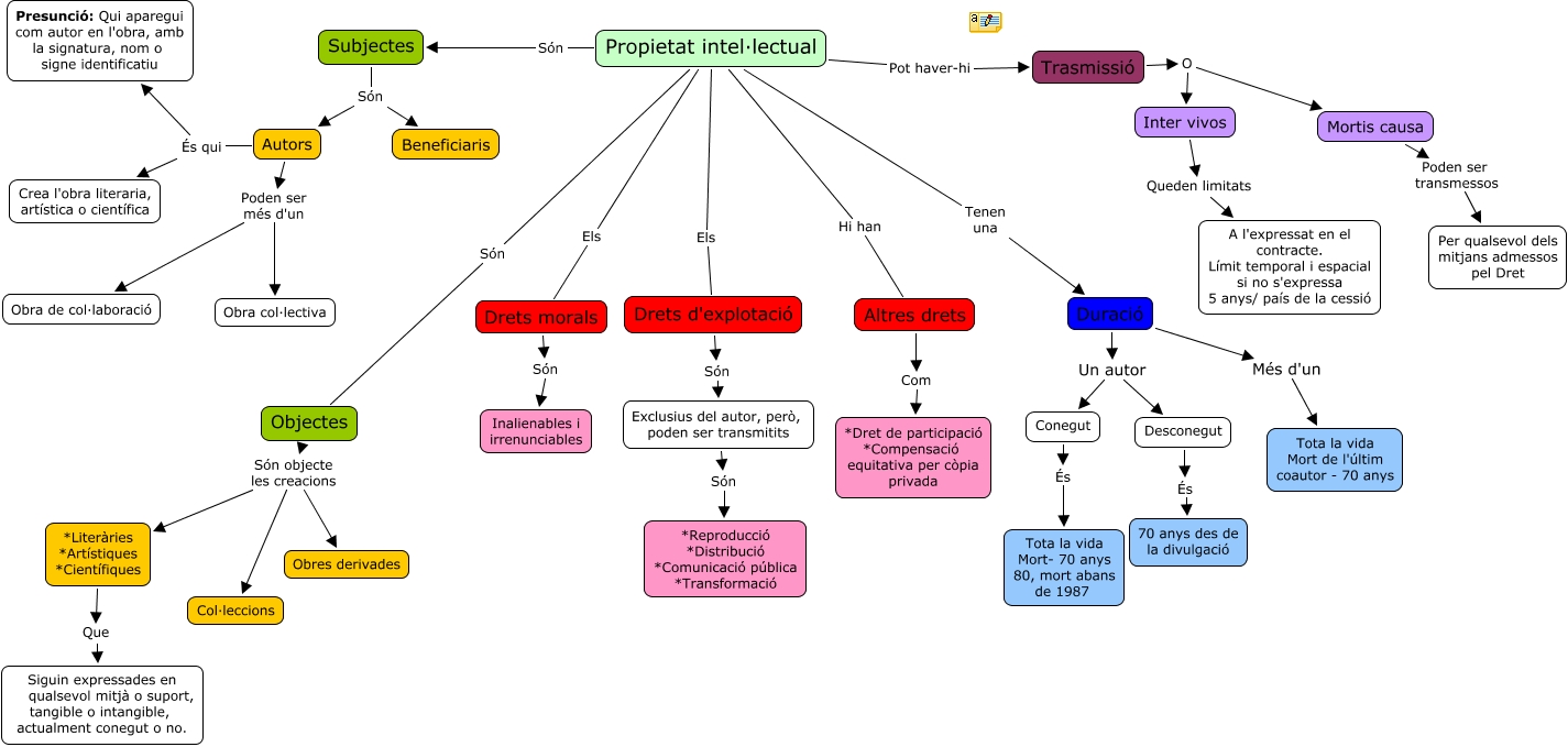 Este Cmap, tiene información relacionada con: Escenari 10 i 11, Propietat intel·lectual Tenen una Duració, Drets morals Són Inalienables i irrenunciables, Autors Poden ser més d'un Obra col·lectiva, Subjectes Són Autors, Mortis causa Poden ser transmessos Per qualsevol dels mitjans admessos pel Dret, Propietat intel·lectual Hi han Altres drets, Duració Un autor Conegut, Duració Més d'un Tota la vida Mort de l'últim coautor - 70 anys, Autors És qui Crea l'obra literaria, artística o científica, Propietat intel·lectual Els Drets d'explotació, Objectes Són objecte les creacions *Literàries *Artístiques *Científiques, Autors És qui Presunció: Qui aparegui com autor en l'obra, amb la signatura, nom o signe identificatiu, Exclusius del autor, però, poden ser transmitits Són *Reproducció *Distribució *Comunicació pública *Transformació, Inter vivos Queden limitats A l'expressat en el contracte. Límit temporal i espacial si no s'expressa 5 anys/ país de la cessió, Objectes Són objecte les creacions Col·leccions, Desconegut És 70 anys des de la divulgació, Autors Poden ser més d'un Obra de col·laboració, Trasmissió O Inter vivos, Conegut És Tota la vida Mort- 70 anys 80, mort abans de 1987, Propietat intel·lectual Són Subjectes