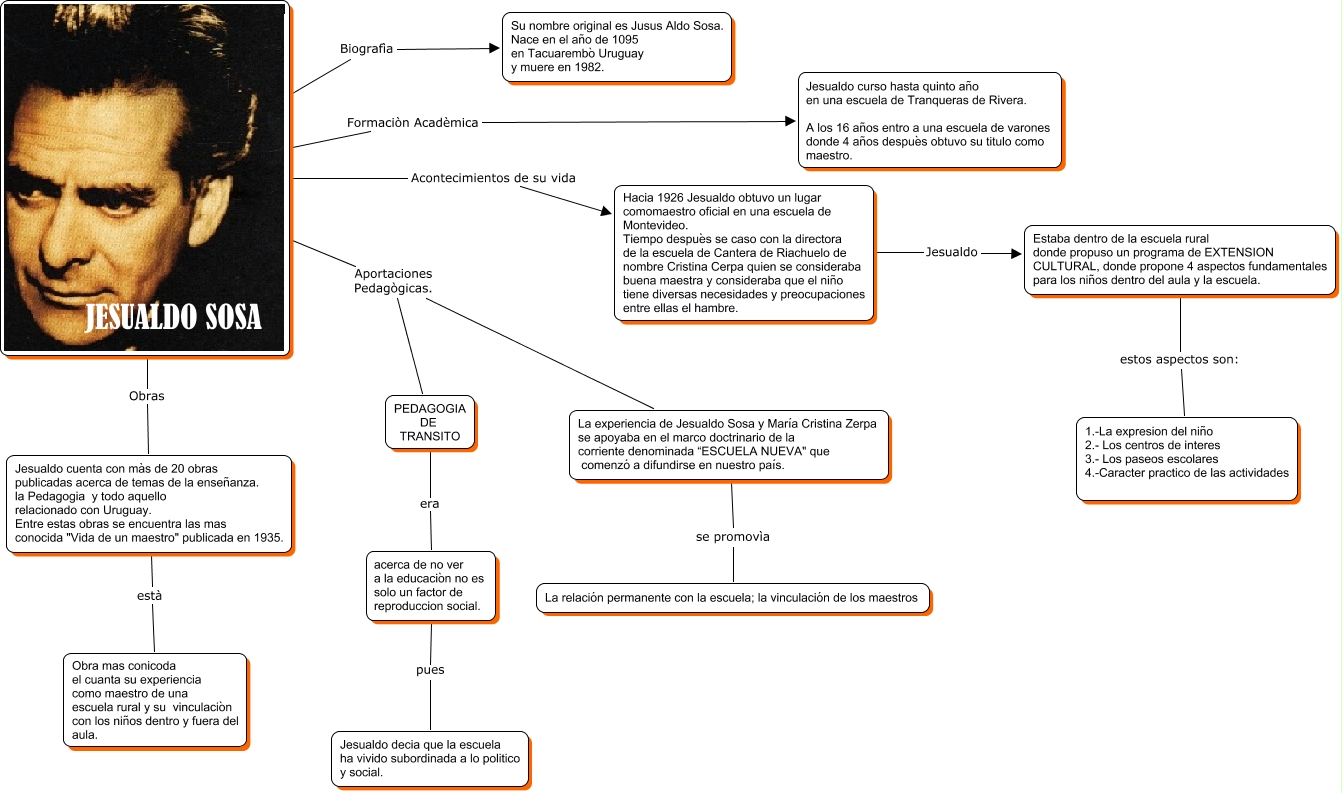 Este Cmap, tiene información relacionada con: Jesualdo Sosa, JESUALDO SOSA Acontecimientos de su vida Hacia 1926 Jesualdo obtuvo un lugar comomaestro oficial en una escuela de Montevideo. Tiempo despuès se caso con la directora de la escuela de Cantera de Riachuelo de nombre Cristina Cerpa quien se consideraba buena maestra y consideraba que el niño tiene diversas necesidades y preocupaciones entre ellas el hambre., JESUALDO SOSA Aportaciones Pedagògicas. PEDAGOGIA DE TRANSITO, Estaba dentro de la escuela rural donde propuso un programa de EXTENSION CULTURAL, donde propone 4 aspectos fundamentales para los niños dentro del aula y la escuela. estos aspectos son: 1.-La expresion del niño 2.- Los centros de interes 3.- Los paseos escolares 4.-Caracter practico de las actividades, Hacia 1926 Jesualdo obtuvo un lugar comomaestro oficial en una escuela de Montevideo. Tiempo despuès se caso con la directora de la escuela de Cantera de Riachuelo de nombre Cristina Cerpa quien se consideraba buena maestra y consideraba que el niño tiene diversas necesidades y preocupaciones entre ellas el hambre. Jesualdo Estaba dentro de la escuela rural donde propuso un programa de EXTENSION CULTURAL, donde propone 4 aspectos fundamentales para los niños dentro del aula y la escuela., JESUALDO SOSA Obras Jesualdo cuenta con màs de 20 obras publicadas acerca de temas de la enseñanza. la Pedagogia y todo aquello relacionado con Uruguay. Entre estas obras se encuentra las mas conocida "Vida de un maestro" publicada en 1935., PEDAGOGIA DE TRANSITO era acerca de no ver a la educaciòn no es solo un factor de reproduccion social., Jesualdo cuenta con màs de 20 obras publicadas acerca de temas de la enseñanza. la Pedagogia y todo aquello relacionado con Uruguay. Entre estas obras se encuentra las mas conocida "Vida de un maestro" publicada en 1935. està Obra mas conicoda el cuanta su experiencia como maestro de una escuela rural y su vinculaciòn con los niños dentro y fuera del aula., JESUALDO SOSA Formaciòn Acadèmica Jesualdo curso hasta quinto año en una escuela de Tranqueras de Rivera. A los 16 años entro a una escuela de varones donde 4 años despuès obtuvo su titulo como maestro., acerca de no ver a la educaciòn no es solo un factor de reproduccion social. pues Jesualdo decia que la escuela ha vivido subordinada a lo politico y social., JESUALDO SOSA Aportaciones Pedagògicas. La experiencia de Jesualdo Sosa y María Cristina Zerpa se apoyaba en el marco doctrinario de la corriente denominada “ESCUELA NUEVA" que comenzó a difundirse en nuestro país., La experiencia de Jesualdo Sosa y María Cristina Zerpa se apoyaba en el marco doctrinario de la corriente denominada “ESCUELA NUEVA" que comenzó a difundirse en nuestro país. se promovìa La relación permanente con la escuela; la vinculación de los maestros, JESUALDO SOSA Biografìa Su nombre original es Jusus Aldo Sosa. Nace en el año de 1095 en Tacuarembò Uruguay y muere en 1982.