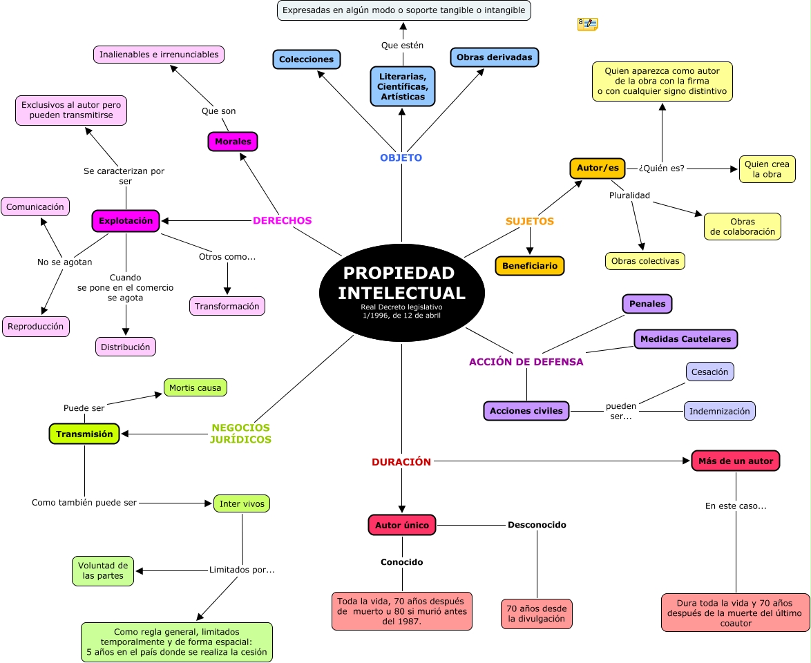 Este Cmap, tiene información relacionada con: c-map caso 11 propiedad intelectual, Inter vivos Limitados por... Como regla general, limitados temporalmente y de forma espacial: 5 años en el país donde se realiza la cesión, Transmisión Puede ser Mortis causa, Inter vivos Limitados por... Voluntad de las partes, Morales Que son Inalienables e irrenunciables, Autor/es Pluralidad Obras de colaboración, PROPIEDAD INTELECTUAL Real Decreto legislativo 1/1996, de 12 de abril ACCIÓN DE DEFENSA Acciones civiles, Explotación Cuando se pone en el comercio se agota Distribución, Más de un autor En este caso... Dura toda la vida y 70 años después de la muerte del último coautor, Autor único Conocido Toda la vida, 70 años después de muerto u 80 si murió antes del 1987., PROPIEDAD INTELECTUAL Real Decreto legislativo 1/1996, de 12 de abril DERECHOS Morales, PROPIEDAD INTELECTUAL Real Decreto legislativo 1/1996, de 12 de abril NEGOCIOS JURÍDICOS Transmisión, PROPIEDAD INTELECTUAL Real Decreto legislativo 1/1996, de 12 de abril SUJETOS Autor/es, Explotación Otros como... Transformación, Autor/es ¿Quién es? Quien crea la obra, PROPIEDAD INTELECTUAL Real Decreto legislativo 1/1996, de 12 de abril OBJETO Colecciones, Explotación No se agotan Comunicación, PROPIEDAD INTELECTUAL Real Decreto legislativo 1/1996, de 12 de abril OBJETO Obras derivadas, Acciones civiles pueden ser... Cesación, PROPIEDAD INTELECTUAL Real Decreto legislativo 1/1996, de 12 de abril SUJETOS Beneficiario, PROPIEDAD INTELECTUAL Real Decreto legislativo 1/1996, de 12 de abril DURACIÓN Autor único
