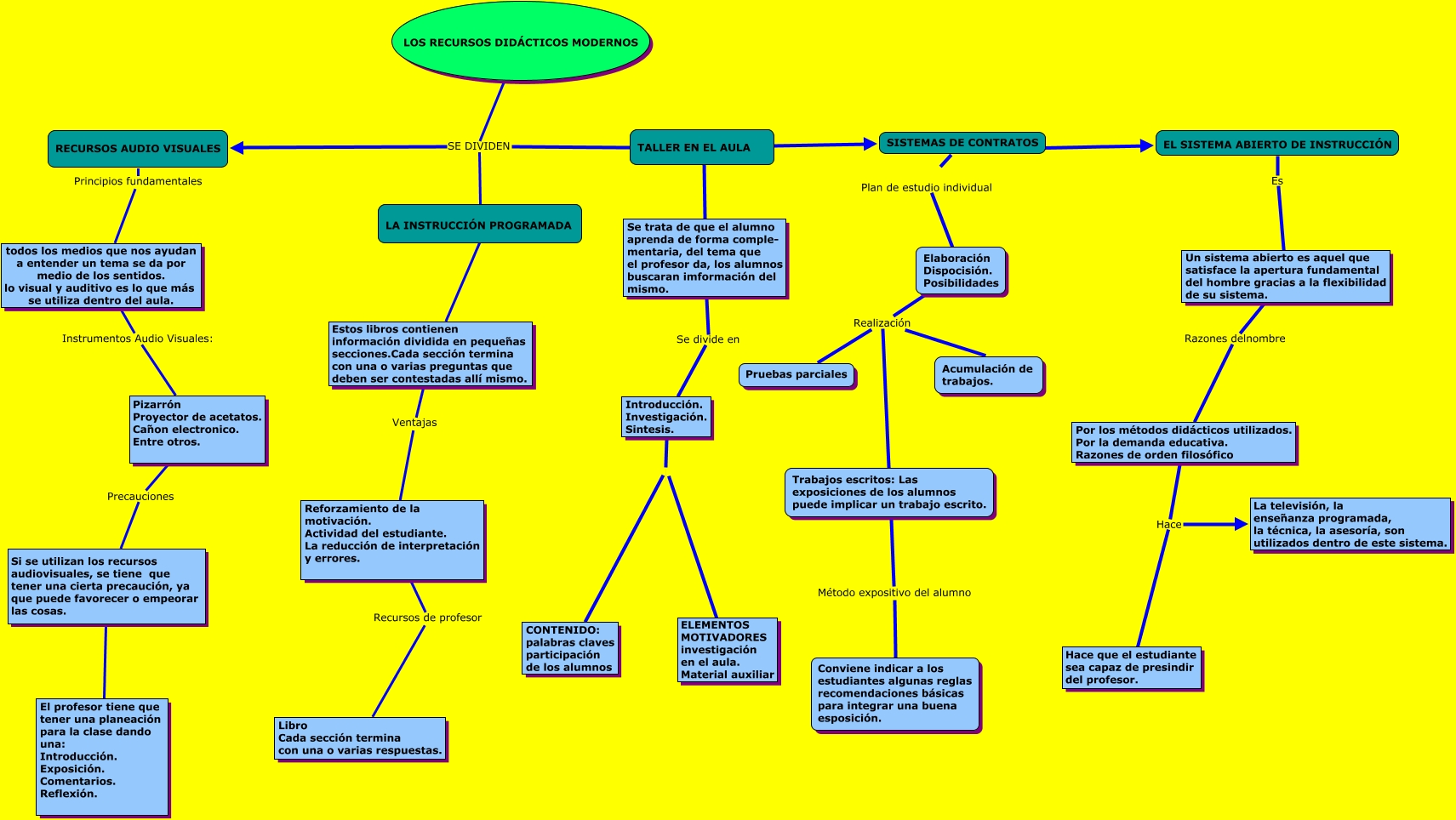 Este Cmap, tiene información relacionada con: RECURSOS DIDACTICOS, El profesor tiene que tener una planeación para la clase dando una: Introducción. Exposición. Comentarios. Reflexión. ???? Si se utilizan los recursos audiovisuales, se tiene que tener una cierta precaución, ya que puede favorecer o empeorar las cosas., Estos libros contienen información dividida en pequeñas secciones.Cada sección termina con una o varias preguntas que deben ser contestadas allí mismo. ???? LA INSTRUCCIÓN PROGRAMADA, Se trata de que el alumno aprenda de forma comple- mentaria, del tema que el profesor da, los alumnos buscaran imformación del mismo. Se divide en Introducción. Investigación. Sintesis., todos los medios que nos ayudan a entender un tema se da por medio de los sentidos. lo visual y auditivo es lo que más se utiliza dentro del aula. Instrumentos Audio Visuales: Pizarrón Proyector de acetatos. Cañon electronico. Entre otros., LOS RECURSOS DIDÁCTICOS MODERNOS SE DIVIDEN LA INSTRUCCIÓN PROGRAMADA, Introducción. Investigación. Sintesis. ELEMENTOS MOTIVADORES investigación en el aula. Material auxiliar, Elaboración Dispocisión. Posibilidades Realización Pruebas parciales, Estos libros contienen información dividida en pequeñas secciones.Cada sección termina con una o varias preguntas que deben ser contestadas allí mismo. Ventajas Reforzamiento de la motivación. Actividad del estudiante. La reducción de interpretación y errores., TALLER EN EL AULA SE DIVIDEN RECURSOS AUDIO VISUALES, Por los métodos didácticos utilizados. Por la demanda educativa. Razones de orden filosófico Hace Hace que el estudiante sea capaz de presindir del profesor., LOS RECURSOS DIDÁCTICOS MODERNOS SE DIVIDEN RECURSOS AUDIO VISUALES, Un sistema abierto es aquel que satisface la apertura fundamental del hombre gracias a la flexibilidad de su sistema. Razones delnombre Por los métodos didácticos utilizados. Por la demanda educativa. Razones de orden filosófico, EL SISTEMA ABIERTO DE INSTRUCCIÓN Es Un sistema abierto es aquel que satisface la apertura fundamental del hombre gracias a la flexibilidad de su sistema., TALLER EN EL AULA SE DIVIDEN LA INSTRUCCIÓN PROGRAMADA, Elaboración Dispocisión. Posibilidades Realización Trabajos escritos: Las exposiciones de los alumnos puede implicar un trabajo escrito., Elaboración Dispocisión. Posibilidades Realización Acumulación de trabajos., Por los métodos didácticos utilizados. Por la demanda educativa. Razones de orden filosófico Hace La televisión, la enseñanza programada, la técnica, la asesoría, son utilizados dentro de este sistema., SISTEMAS DE CONTRATOS Plan de estudio individual Elaboración Dispocisión. Posibilidades, SISTEMAS DE CONTRATOS ???? EL SISTEMA ABIERTO DE INSTRUCCIÓN, Pizarrón Proyector de acetatos. Cañon electronico. Entre otros. Precauciones Si se utilizan los recursos audiovisuales, se tiene que tener una cierta precaución, ya que puede favorecer o empeorar las cosas.