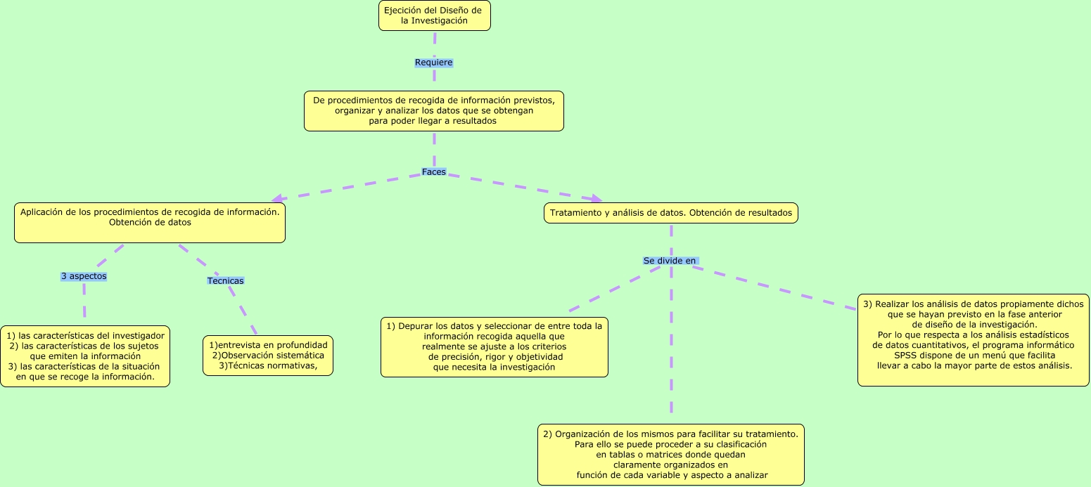 Este Cmap, tiene información relacionada con: Ejecucion del Diseño de la Investigacion, Aplicación de los procedimientos de recogida de información. Obtención de datos Tecnicas 1)entrevista en profundidad 2)Observación sistemática 3)Técnicas normativas,, De procedimientos de recogida de información previstos, organizar y analizar los datos que se obtengan para poder llegar a resultados Faces Tratamiento y análisis de datos. Obtención de resultados, Tratamiento y análisis de datos. Obtención de resultados Se divide en 3) Realizar los análisis de datos propiamente dichos que se hayan previsto en la fase anterior de diseño de la investigación. Por lo que respecta a los análisis estadísticos de datos cuantitativos, el programa informático SPSS dispone de un menú que facilita llevar a cabo la mayor parte de estos análisis., Tratamiento y análisis de datos. Obtención de resultados Se divide en 1) Depurar los datos y seleccionar de entre toda la información recogida aquella que realmente se ajuste a los criterios de precisión, rigor y objetividad que necesita la investigación, Tratamiento y análisis de datos. Obtención de resultados Se divide en 2) Organización de los mismos para facilitar su tratamiento. Para ello se puede proceder a su clasificación en tablas o matrices donde quedan claramente organizados en función de cada variable y aspecto a analizar, De procedimientos de recogida de información previstos, organizar y analizar los datos que se obtengan para poder llegar a resultados Faces Aplicación de los procedimientos de recogida de información. Obtención de datos, Aplicación de los procedimientos de recogida de información. Obtención de datos 3 aspectos 1) las características del investigador 2) las características de los sujetos que emiten la información 3) las características de la situación en que se recoge la información., Ejecición del Diseño de la Investigación Requiere De procedimientos de recogida de información previstos, organizar y analizar los datos que se obtengan para poder llegar a resultados