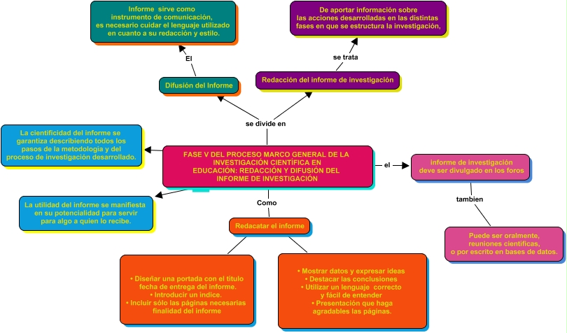 Este Cmap, tiene información relacionada con: fase V del marco general, FASE V DEL PROCESO MARCO GENERAL DE LA INVESTIGACIÓN CIENTÍFICA EN EDUCACIÓN: REDACCIÓN Y DIFUSIÓN DEL INFORME DE INVESTIGACIÓN Como Redacatar el informe, FASE V DEL PROCESO MARCO GENERAL DE LA INVESTIGACIÓN CIENTÍFICA EN EDUCACIÓN: REDACCIÓN Y DIFUSIÓN DEL INFORME DE INVESTIGACIÓN ???? La cientificidad del informe se garantiza describiendo todos los pasos de la metodología y del proceso de investigación desarrollado., Redacción del informe de investigación se trata De aportar información sobre las acciones desarrolladas en las distintas fases en que se estructura la investigación,, informe de investigación deve ser divulgado en los foros tambien Puede ser oralmente, reuniones científicas, o por escrito en bases de datos., FASE V DEL PROCESO MARCO GENERAL DE LA INVESTIGACIÓN CIENTÍFICA EN EDUCACIÓN: REDACCIÓN Y DIFUSIÓN DEL INFORME DE INVESTIGACIÓN ???? La utilidad del informe se manifiesta en su potencialidad para servir para algo a quien lo recibe., FASE V DEL PROCESO MARCO GENERAL DE LA INVESTIGACIÓN CIENTÍFICA EN EDUCACIÓN: REDACCIÓN Y DIFUSIÓN DEL INFORME DE INVESTIGACIÓN el informe de investigación deve ser divulgado en los foros, FASE V DEL PROCESO MARCO GENERAL DE LA INVESTIGACIÓN CIENTÍFICA EN EDUCACIÓN: REDACCIÓN Y DIFUSIÓN DEL INFORME DE INVESTIGACIÓN se divide en Difusión del Informe, Difusión del Informe El Informe sirve como instrumento de comunicación, es necesario cuidar el lenguaje utilizado en cuanto a su redacción y estilo., FASE V DEL PROCESO MARCO GENERAL DE LA INVESTIGACIÓN CIENTÍFICA EN EDUCACIÓN: REDACCIÓN Y DIFUSIÓN DEL INFORME DE INVESTIGACIÓN se divide en Redacción del informe de investigación, Redacatar el informe ???? • Diseñar una portada con el título fecha de entrega del informe. • Introducir un índice. • Incluir sólo las páginas necesarias finalidad del informe, Redacatar el informe ???? • Mostrar datos y expresar ideas • Destacar las conclusiones • Utilizar un lenguaje correcto y fácil de entender • Presentación que haga agradables las páginas.