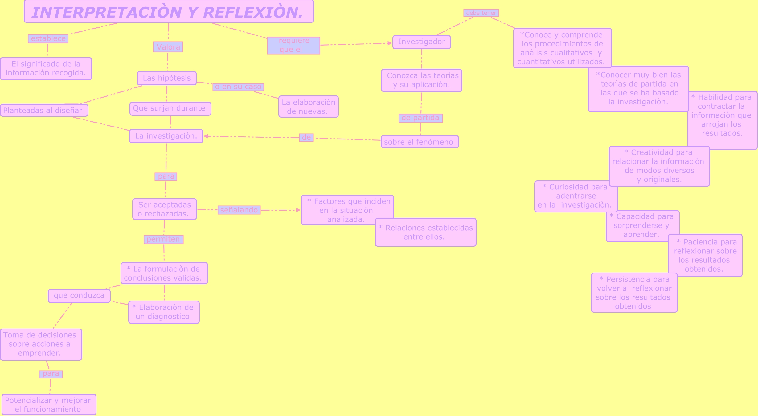 Este Cmap, tiene información relacionada con: INTERPRETACIÒN Y REFLEXIÒN, * La formulaciòn de conclusiones validas. que que conduzca, Las hipòtesis ???? Que surjan durante, sobre el fenòmeno de La investigaciòn., Investigador debe tener * Habilidad para contractar la informaciòn que arrojan los resultados., * Elaboraciòn de un diagnostico ???? que conduzca, Ser aceptadas o rechazadas. señalando * Factores que inciden en la situaciòn analizada., Investigador ???? Conozca las teorìas y su aplicaciòn., Planteadas al diseñar ???? La investigaciòn., Las hipòtesis o en su caso La elaboraciòn de nuevas., Toma de decisiones sobre acciones a emprender. para Potencializar y mejorar el funcionamiento, * La formulaciòn de conclusiones validas. ???? * Elaboraciòn de un diagnostico, Las hipòtesis ???? Planteadas al diseñar, Ser aceptadas o rechazadas. permiten * La formulaciòn de conclusiones validas., INTERPRETACIÒN Y REFLEXIÒN. requiere que el Investigador, INTERPRETACIÒN Y REFLEXIÒN. Valora Las hipòtesis, Conozca las teorìas y su aplicaciòn. de partida sobre el fenòmeno, La investigaciòn. para Ser aceptadas o rechazadas., INTERPRETACIÒN Y REFLEXIÒN. establece El significado de la información recogida., Que surjan durante ???? La investigaciòn., que conduzca ???? Toma de decisiones sobre acciones a emprender.