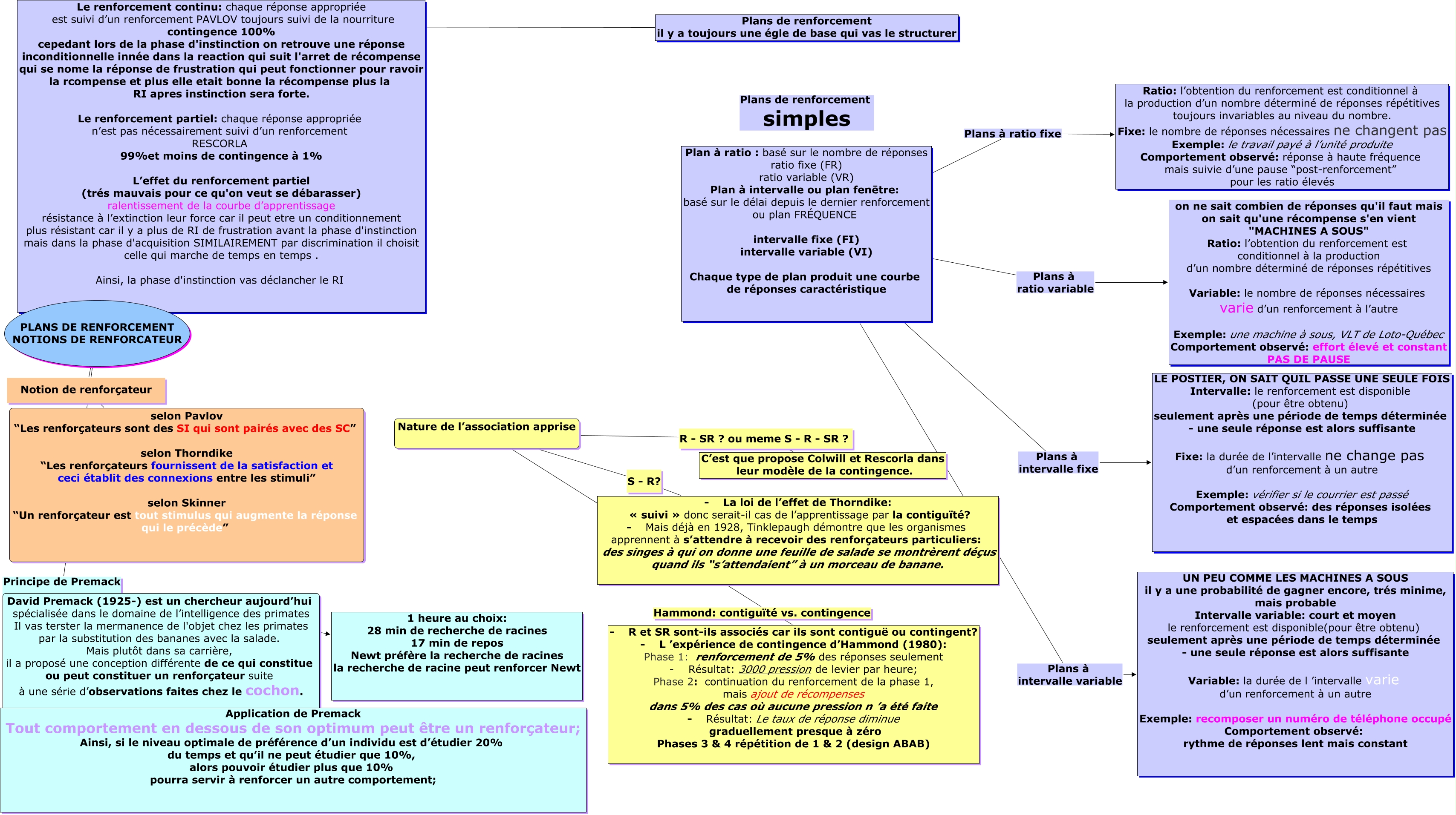 Cette carte de concepts créée avec IHMC CmapTools traite de: Plans de Renforcement Bloc8, Nature de l’association apprise S - R? - La loi de l’effet de Thorndike: « suivi » donc serait-il cas de l’apprentissage par la contiguïté? - Mais déjà en 1928, Tinklepaugh démontre que les organismes apprennent à s’attendre à recevoir des renforçateurs particuliers: des singes à qui on donne une feuille de salade se montrèrent déçus quand ils “s’attendaient” à un morceau de banane., Plan à ratio : basé sur le nombre de réponses ratio fixe (FR) ratio variable (VR) Plan à intervalle ou plan fenētre: basé sur le délai depuis le dernier renforcement ou plan FRÉQUENCE intervalle fixe (FI) intervalle variable (VI) Chaque type de plan produit une courbe de réponses caractéristique Plans à ratio variable on ne sait combien de réponses qu'il faut mais on sait qu'une récompense s'en vient "MACHINES A SOUS" Ratio: l’obtention du renforcement est conditionnel à la production d’un nombre déterminé de réponses répétitives Variable: le nombre de réponses nécessaires varie d’un renforcement à l’autre Exemple: une machine à sous, VLT de Loto-Québec Comportement observé: effort élevé et constant PAS DE PAUSE, PLANS DE RENFORCEMENT NOTIONS DE RENFORCATEUR Notion de renforçateur selon Pavlov “Les renforçateurs sont des SI qui sont pairés avec des SC” selon Thorndike “Les renforçateurs fournissent de la satisfaction et ceci établit des connexions entre les stimuli” selon Skinner “Un renforçateur est tout stimulus qui augmente la réponse qui le précède”, Plan à ratio : basé sur le nombre de réponses ratio fixe (FR) ratio variable (VR) Plan à intervalle ou plan fenētre: basé sur le délai depuis le dernier renforcement ou plan FRÉQUENCE intervalle fixe (FI) intervalle variable (VI) Chaque type de plan produit une courbe de réponses caractéristique Plans à intervalle fixe LE POSTIER, ON SAIT QUIL PASSE UNE SEULE FOIS Intervalle: le renforcement est disponible (pour être obtenu) seulement après une période de temps déterminée - une seule réponse est alors suffisante Fixe: la durée de l’intervalle ne change pas d’un renforcement à un autre Exemple: vérifier si le courrier est passé Comportement observé: des réponses isolées et espacées dans le temps, Plans de renforcement il y a toujours une égle de base qui vas le structurer Plans de renforcement simples Plan à ratio : basé sur le nombre de réponses ratio fixe (FR) ratio variable (VR) Plan à intervalle ou plan fenētre: basé sur le délai depuis le dernier renforcement ou plan FRÉQUENCE intervalle fixe (FI) intervalle variable (VI) Chaque type de plan produit une courbe de réponses caractéristique, Nature de l’association apprise R - SR ? ou meme S - R - SR ? C’est que propose Colwill et Rescorla dans leur modèle de la contingence., Plan à ratio : basé sur le nombre de réponses ratio fixe (FR) ratio variable (VR) Plan à intervalle ou plan fenētre: basé sur le délai depuis le dernier renforcement ou plan FRÉQUENCE intervalle fixe (FI) intervalle variable (VI) Chaque type de plan produit une courbe de réponses caractéristique Plans à intervalle variable UN PEU COMME LES MACHINES A SOUS il y a une probabilité de gagner encore, trés minime, mais probable Intervalle variable: court et moyen le renforcement est disponible(pour être obtenu) seulement après une période de temps déterminée - une seule réponse est alors suffisante Variable: la durée de l ’intervalle varie d’un renforcement à un autre Exemple: recomposer un numéro de téléphone occupé Comportement observé: rythme de réponses lent mais constant, Plans de renforcement il y a toujours une égle de base qui vas le structurer Renforcement continu vs renforcement partiel Le renforcement continu: chaque réponse appropriée est suivi d’un renforcement PAVLOV toujours suivi de la nourriture contingence 100% cepedant lors de la phase d'instinction on retrouve une réponse inconditionnelle innée dans la reaction qui suit l'arret de récompense qui se nome la réponse de frustration qui peut fonctionner pour ravoir la rcompense et plus elle etait bonne la récompense plus la RI apres instinction sera forte. Le renforcement partiel: chaque réponse appropriée n’est pas nécessairement suivi d’un renforcement RESCORLA 99%et moins de contingence à 1% L’effet du renforcement partiel (trés mauvais pour ce qu'on veut se débarasser) ralentissement de la courbe d’apprentissage résistance à l’extinction leur force car il peut etre un conditionnement plus résistant car il y a plus de RI de frustration avant la phase d'instinction mais dans la phase d'acquisition SIMILAIREMENT par discrimination il choisit celle qui marche de temps en temps . Ainsi, la phase d'instinction vas déclancher le RI, PLANS DE RENFORCEMENT NOTIONS DE RENFORCATEUR Principe de Premack 1 heure au choix: 28 min de recherche de racines 17 min de repos Newt préfère la recherche de racines la recherche de racine peut renforcer Newt, PLANS DE RENFORCEMENT NOTIONS DE RENFORCATEUR Principe de Premack David Premack (1925-) est un chercheur aujourd’hui spécialisée dans le domaine de l’intelligence des primates Il vas terster la mermanence de l'objet chez les primates par la substitution des bananes avec la salade. Mais plutôt dans sa carrière, il a proposé une conception différente de ce qui constitue ou peut constituer un renforçateur suite à une série d’observations faites chez le cochon., Nature de l’association apprise Hammond: contiguïté vs. contingence - R et SR sont-ils associés car ils sont contiguë ou contingent? - L ’expérience de contingence d’Hammond (1980): Phase 1: renforcement de 5% des réponses seulement - Résultat: 3000 pression de levier par heure; Phase 2: continuation du renforcement de la phase 1, mais ajout de récompenses dans 5% des cas où aucu