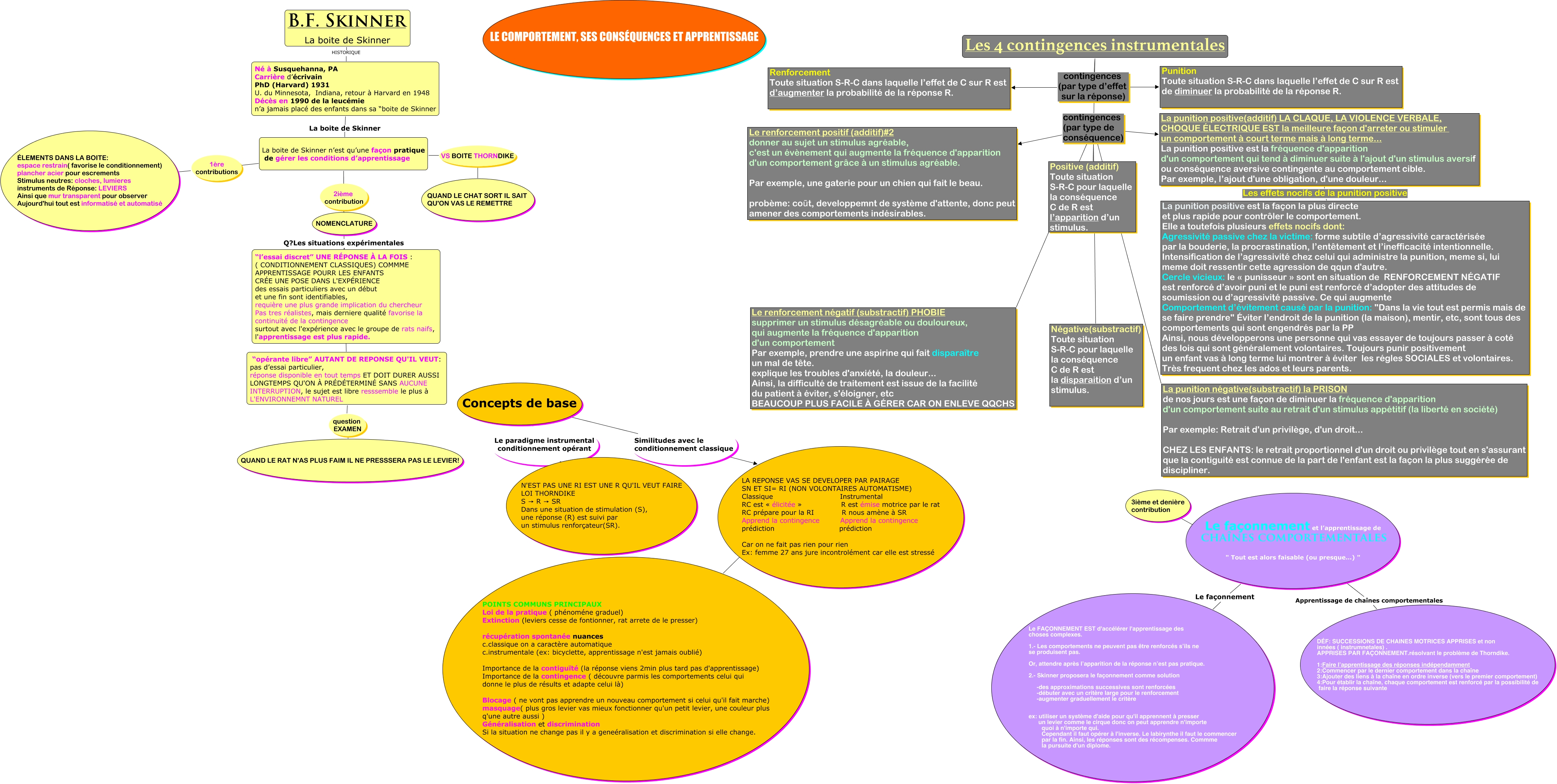 Cette carte de concepts créée avec IHMC CmapTools traite de: comportement, conséquences,apprentissage bloc7, La punition positive(additif) LA CLAQUE, LA VIOLENCE VERBALE, CHOQUE ÉLECTRIQUE EST la meilleure façon d'arreter ou stimuler un comportement à court terme mais à long terme... La punition positive est la fréquence d'apparition d'un comportement qui tend à diminuer suite à l'ajout d'un stimulus aversif ou conséquence aversive contingente au comportement cible. Par exemple, l’ajout d'une obligation, d'une douleur... Les effets nocifs de la punition positive La punition positive est la façon la plus directe et plus rapide pour contrôler le comportement. Elle a toutefois plusieurs effets nocifs dont: Agressivité passive chez la victime: forme subtile d’agressivité caractérisée par la bouderie, la procrastination, l’entêtement et l’inefficacité intentionnelle. Intensification de l’agressivité chez celui qui administre la punition, meme si, lui meme doit ressentir cette agression de qqun d'autre. Cercle vicieux: le « punisseur » sont en situation de RENFORCEMENT NÉGATIF est renforcé d’avoir puni et le puni est renforcé d’adopter des attitudes de soumission ou d’agressivité passive. Ce qui augmente Comportement d’évitement causé par la punition: "Dans la vie tout est permis mais de se faire prendre" Éviter l’endroit de la punition (la maison), mentir, etc, sont tous des comportements qui sont engendrés par la PP Ainsi, nous développerons une personne qui vas essayer de toujours passer à coté des lois qui sont généralement volontaires. Toujours punir positivement un enfant vas à long terme lui montrer à éviter les régles SOCIALES et volontaires. Très frequent chez les ados et leurs parents., Les 4 contingences instrumentales contingences (par type de conséquence) Le renforcement positif (additif)#2 donner au sujet un stimulus agréable, c'est un évènement qui augmente la fréquence d'apparition d'un comportement grâce à un stimulus agréable. Par exemple, une gaterie pour un chien qui fait le beau. probème: coūt, developpemnt de système d'attente, donc peut amener des comportements indésirables., LA REPONSE VAS SE DEVELOPER PAR PAIRAGE SN ET SI= RI (NON VOLONTAIRES AUTOMATISME) Classique Instrumental RC est « élicitée » R est émise motrice par le rat RC prépare pour la RI R nous amène à SR Apprend la contingence Apprend la contingence prédiction prédiction Car on ne fait pas rien pour rien Ex: femme 27 ans jure incontrolément car elle est stressé ???? POINTS COMMUNS PRINCIPAUX Loi de la pratique ( phénoméne graduel) Extinction (leviers cesse de fontionner, rat arrete de le presser) récupération spontanée nuances c.classique on a caractère automatique c.instrumentale (ex: bicyclette, apprentissage n'est jamais oublié) Importance de la contiguïté (la réponse viens 2min plus tard pas d'apprentissage) Importance de la contingence ( découvre parmis les comportements celui qui donne le plus de résults et adapte celui là) Blocage ( ne vont pas apprendre un nouveau comportement si celui qu'il fait marche) masquage( plus gros levier vas mieux fonctionner qu'un petit levier, une couleur plus q'une autre aussi ) Généralisation et discrimination Si la situation ne change pas il y a geneéralisation et discrimination si elle change., La boite de Skinner n’est qu’une façon pratique de gérer les conditions d’apprentissage Q?Les situations expérimentales “l’essai discret” UNE RÉPONSE À LA FOIS : ( CONDITIONNEMENT CLASSIQUES) COMMME APPRENTISSAGE POURR LES ENFANTS CRÉE UNE POSE DANS L'EXPÉRIENCE des essais particuliers avec un début et une fin sont identifiables, requière une plus grande implication du chercheur Pas tres réalistes, mais derniere qualité favorise la continuité de la contingence surtout avec l'expérience avec le groupe de rats naifs, l'apprentissage est plus rapide., Le façonnement et l’apprentissage de chaînes comportementales " Tout est alors faisable (ou presque…) " Le façonnement Le FAÇONNEMENT EST d'accélérer l'apprentissage des choses complexes. 1.- Les comportements ne peuvent pas être renforcés s’ils ne se produisent pas. Or, attendre après l’apparition de la réponse n’est pas pratique. 2.- Skinner proposera le façonnement comme solution -des approximations successives sont renforcées -débuter avec un critère large pour le renforcement -augmenter graduellement le critère ex: utiliser un système d'aide pour qu'il apprennent à presser un levier comme le cirque donc on peut apprendre n'importe quoi à n'importe qui. Cependant il faut opérer à l'inverse. Le labirynthe il faut le commencer par la fin. Ainsi, les réponses sont des récompenses. Commme la pursuite d'un diplome., Les 4 contingences instrumentales contingences (par type d’effet sur la réponse) Punition Toute situation S-R-C dans laquelle l’effet de C sur R est de diminuer la probabilité de la réponse R., Les 4 contingences instrumentales contingences (par type de conséquence) Le renforcement négatif (substractif) PHOBIE supprimer un stimulus désagréable ou douloureux, qui augmente la fréquence d'apparition d'un comportement Par exemple, prendre une aspirine qui fait disparaître un mal de tête. explique les troubles d'anxiété, la douleur... Ainsi, la difficulté de traitement est issue de la facilité du patient à éviter, s'éloigner, etc BEAUCOUP PLUS FACILE À GÉRER CAR ON ENLEVE QQCHS, Les 4 contingences instrumentales contingences (par type de conséquence) La punition positive(additif) LA CLAQUE, LA VIOLENCE VERBALE, CHOQUE ÉLECTRIQUE EST la meilleure façon d'arreter ou stimuler un comportement à court terme mais à long terme... La punition positive est la fréquence d'apparition d'un comportement qui tend à diminuer suite à l'ajout d'un stimulus aversif ou conséquence aversive contingente au comportement cible. Par exemple, l’ajout d'une obliga