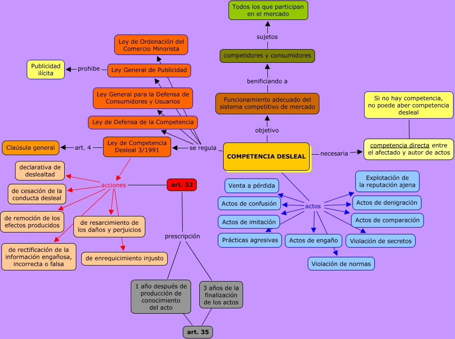 Este Cmap, tiene información relacionada con: z Corección Competencia desleal, Ley General de Publicidad prohibe Publicidad ilícita, COMPETENCIA DESLEAL actos Actos de comparación, COMPETENCIA DESLEAL actos Violación de normas, art. 32 prescripción 1 año después de producción de conocimiento del acto, Ley de Competencia Desleal 3/1991 acciones declarativa de deslealtad, art. 32 acciones declarativa de deslealtad, Ley de Competencia Desleal 3/1991 acciones de resarcimiento de los daños y perjuicios, COMPETENCIA DESLEAL se regula Ley de Ordenación del Comercio Minorista, COMPETENCIA DESLEAL actos Prácticas agresivas, Ley de Competencia Desleal 3/1991 acciones de rectificación de la información engañosa, incorrecta o falsa, Ley de Competencia Desleal 3/1991 acciones de remoción de los efectos producidos, COMPETENCIA DESLEAL objetivo Funcionamiento adecuado del sistema competitivo de mercado, COMPETENCIA DESLEAL actos Actos de confusión, COMPETENCIA DESLEAL actos Actos de imitación, Ley de Competencia Desleal 3/1991 art. 4 Claúsula general, COMPETENCIA DESLEAL se regula Ley de Defensa de la Competencia, art. 32 acciones de cesación de la conducta desleal, competencia directa entre el afectado y autor de actos fgd Si no hay competencia, no poede aber competencia desleal, 1 año después de producción de conocimiento del acto ???? art. 35, COMPETENCIA DESLEAL actos Violación de secretos