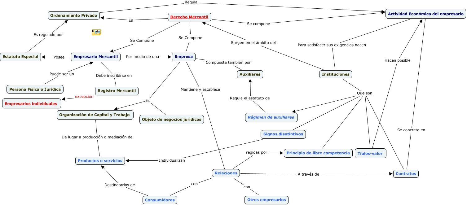 Este Cmap, tiene información relacionada con: mapa conceptual 1, Relaciones con Consumidores, Instituciones Que son Régimen de auxiliares, Régimen de auxiliares Regula el estatuto de Auxiliares, Relaciones regidas por Principio de libre competencia, Instituciones Que son Contratos, Relaciones con Otros empresarios, Empresario Mercantil Por medio de una Empresa, Persona Física o Jurídica Puede ser un Empresario Mercantil, Empresario Mercantil Debe inscribirse en Registro Mercantil, Empresa Es Organización de Capital y Trabajo, Empresario Mercantil Posee Estatuto Especial, Derecho Mercantil Es Ordenamiento Privado, Organización de Capital y Trabajo Da lugar a producción o mediación de Productos o servicios, Empresa Mantiene y establece Relaciones, Instituciones Que son Signos disntintivos, Empresa Compuesta también por Auxiliares, Registro Mercantil excepción Empresarios individuales, Estatuto Especial Es regulado por Ordenamiento Privado, Relaciones A través de Contratos, Derecho Mercantil Se Compone Empresa