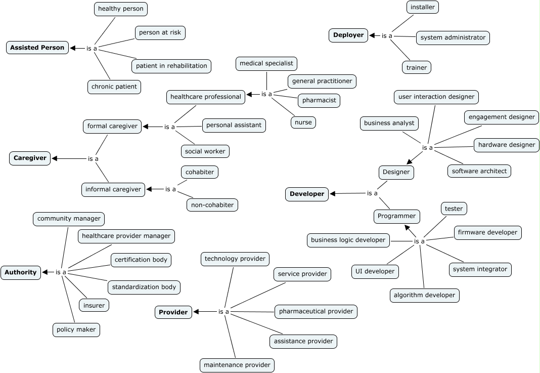 Questa Cmap, creata con IHMC CmapTools, contiene informazioni relative a: Actors, business logic developer is a Programmer, policy maker is a Authority, installer is a Deployer, informal caregiver is a Caregiver, firmware developer is a Programmer, pharmaceutical provider is a Provider, system administrator is a Deployer, patient in rehabilitation is a Assisted Person, general practitioner is a healthcare professional, chronic patient is a Assisted Person, trainer is a Deployer, system integrator is a Programmer, Designer is a Developer, tester is a Programmer, insurer is a Authority, software architect is a Designer, service provider is a Provider, technology provider is a Provider, cohabiter is a informal caregiver, user interaction designer is a Designer
