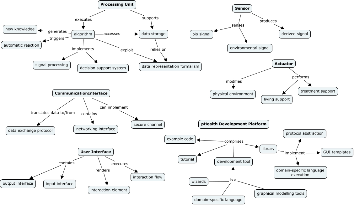 Questa Cmap, creata con IHMC CmapTools, contiene informazioni relative a: Artefacts, Actuator performs living support, library implement domain-specific language execution, CommunicationInterface contains networking interface, algorithm generates new knowledge, Actuator modifies physical environment, domain-specific language is a development tool, Actuator performs treatment support, User Interface contains output interface, domain-specific language is a wizards, Sensor senses bio signal, Processing Unit supports data storage, CommunicationInterface can implement secure channel, pHealth Development Platform comprises development tool, algorithm implements signal processing, data storage relies on data representation formalism, pHealth Development Platform comprises library, pHealth Development Platform comprises example code, Sensor produces derived signal, Processing Unit executes algorithm, library implement GUI templates