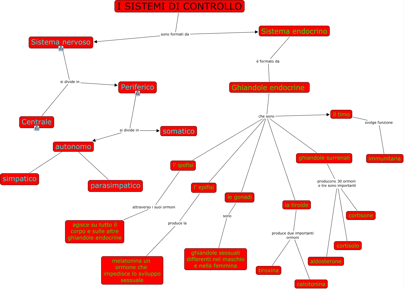 Questa Cmap, creata con IHMC CmapTools, contiene informazioni relative a: I sistemi di controllo, Ghiandole endocrine che sono le gonadi, ghiandole surrenali producono 30 ormoni e tre sono importanti cortisone, autonomo ???? simpatico, Sistema nervoso si divide in Centrale, Ghiandole endocrine che sono il timo, Ghiandole endocrine che sono l' ipofisi, ghiandole surrenali producono 30 ormoni e tre sono importanti cortisolo, l' ipofisi attraverso i suoi ormoni agisce su tutto il corpo e sulle altre ghiandole endocrine, I SISTEMI DI CONTROLLO sono formati da Sistema nervoso, autonomo ???? parasimpatico, le gonadi sono ghiandole sessuali differenti nel maschio e nella femmina, Ghiandole endocrine che sono l' epifisi, la tiroide produce due importanti ormoni calcitonina, ghiandole surrenali producono 30 ormoni e tre sono importanti aldosterone, Sistema nervoso si divide in Periferico, l' epifisi produce la melatonina un ormone che impedisce lo sviluppo sessuale, Ghiandole endocrine che sono ghiandole surrenali, la tiroide produce due importanti ormoni tiroxina, Periferico si divide in somatico, Periferico si divide in autonomo