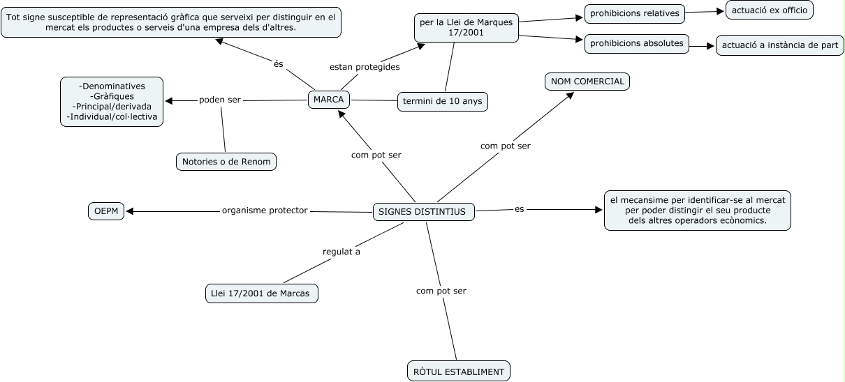 Este Cmap, tiene información relacionada con: SIGNES DISTINTIUS MARQUES, per la Llei de Marques 17/2001 ???? termini de 10 anys, SIGNES DISTINTIUS es el mecansime per identificar-se al mercat per poder distingir el seu producte dels altres operadors ecònomics., per la Llei de Marques 17/2001 ???? prohibicions relatives, prohibicions absolutes ???? actuació a instància de part, MARCA és Tot signe susceptible de representació gràfica que serveixi per distinguir en el mercat els productes o serveis d'una empresa dels d'altres., SIGNES DISTINTIUS regulat a Llei 17/2001 de Marcas, MARCA estan protegides per la Llei de Marques 17/2001, SIGNES DISTINTIUS com pot ser RÒTUL ESTABLIMENT, MARCA poden ser Notories o de Renom, SIGNES DISTINTIUS com pot ser NOM COMERCIAL, SIGNES DISTINTIUS organisme protector OEPM, MARCA poden ser -Denominatives -Gràfiques -Principal/derivada -Individual/col·lectiva, MARCA ???? termini de 10 anys, SIGNES DISTINTIUS com pot ser MARCA, prohibicions relatives ???? actuació ex officio, per la Llei de Marques 17/2001 ???? prohibicions absolutes