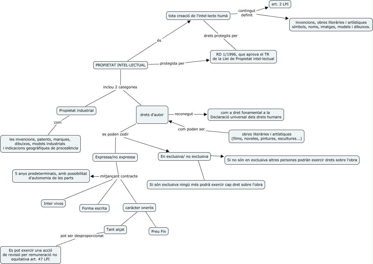 Este Cmap, tiene información relacionada con: PROPIETAT INTEL·LECTUAL, obres literàries i artístiques (films, noveles, pintures, escultures...) com poden ser drets d'autor, PROPIETAT INTEL·LECTUAL inclou 2 categories drets d'autor, Expressa/no expressa mitjançant contracte Forma escrita, PROPIETAT INTEL·LECTUAL inclou 2 categories Propietat industrial, drets d'autor reconegut com a dret fonamental a la Declaració universal dels drets humans, En exclusiva/ no exclusiva ???? Si no són en exclusiva altres persones podràn exercir drets sobre l'obra, caràcter oneròs ???? Preu Fix, tota creació de l'intel·lecte humà drets protegits per RD 1/1996, que aprova el TR de la Llei de Propietat intel·lectual, drets d'autor es poden cedir En exclusiva/ no exclusiva, PROPIETAT INTEL·LECTUAL protegida per RD 1/1996, que aprova el TR de la Llei de Propietat intel·lectual, En exclusiva/ no exclusiva ???? Si són exclusiva ningú més podrà exercir cap dret sobre l'obra, tota creació de l'intel·lecte humà contingut definit invencions, obres literàries i artístiques símbols, noms, imatges, models i dibuixos., Tant alçat pot ser desproporcionat Es pot exercir una acció de revisió per remuneració no equitativa art. 47 LPI, caràcter oneròs ???? Tant alçat, Propietat industrial com les invencions, patents, marques, dibuixos, models industrials i indicacions geogràfiques de procedència, Expressa/no expressa mitjançant contracte 5 anys predeterminats, amb possibilitat d'autonomia de les parts, drets d'autor es poden cedir Expressa/no expressa, PROPIETAT INTEL·LECTUAL és tota creació de l'intel·lecte humà, Expressa/no expressa mitjançant contracte Inter vivos, Expressa/no expressa mitjançant contracte caràcter oneròs