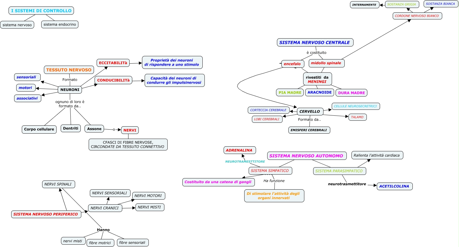 Questa Cmap, creata con IHMC CmapTools, contiene informazioni relative a: SCHEMI, rivestiti da MENINGI ???? encefalo, SISTEMA NERVOSO PERIFERICO ???? NERVI SPINALI, CERVELLO ???? CORTECCIA CEREBRALE, I SISTEMI DI CONTROLLO ???? sistema nervoso, I SISTEMI DI CONTROLLO ???? sistema endocrino, SISTEMA PARASIMPATICO ???? Rallenta l'attività cardiaca, SISTEMA NERVOSO AUTONOMO ???? SISTEMA PARASIMPATICO, NERVI CRANICI ???? NERVI MISTI, SISTEMA SIMPATICO NEUROTRAMESTTITORE ADRENALINA, CORDONE NERVOSO BIANCO ???? SOSTANZA BIANCA, NERVI SPINALI Hanno fibre motrici, CERVELLO ???? CELLULE NEUROSECRETRICI, SISTEMA NERVOSO PERIFERICO ???? NERVI CRANICI, NEURONI ognuno di loro è formato da.. Corpo cellulare, NEURONI ???? motori, NEURONI ???? associativi, NERVI SPINALI Hanno fibre sensoriali, CERVELLO ???? TALAMO, NEURONI ???? sensoriali, ECCITABILITà ???? Proprietà dei neuroni di rispondere a uno stimolo