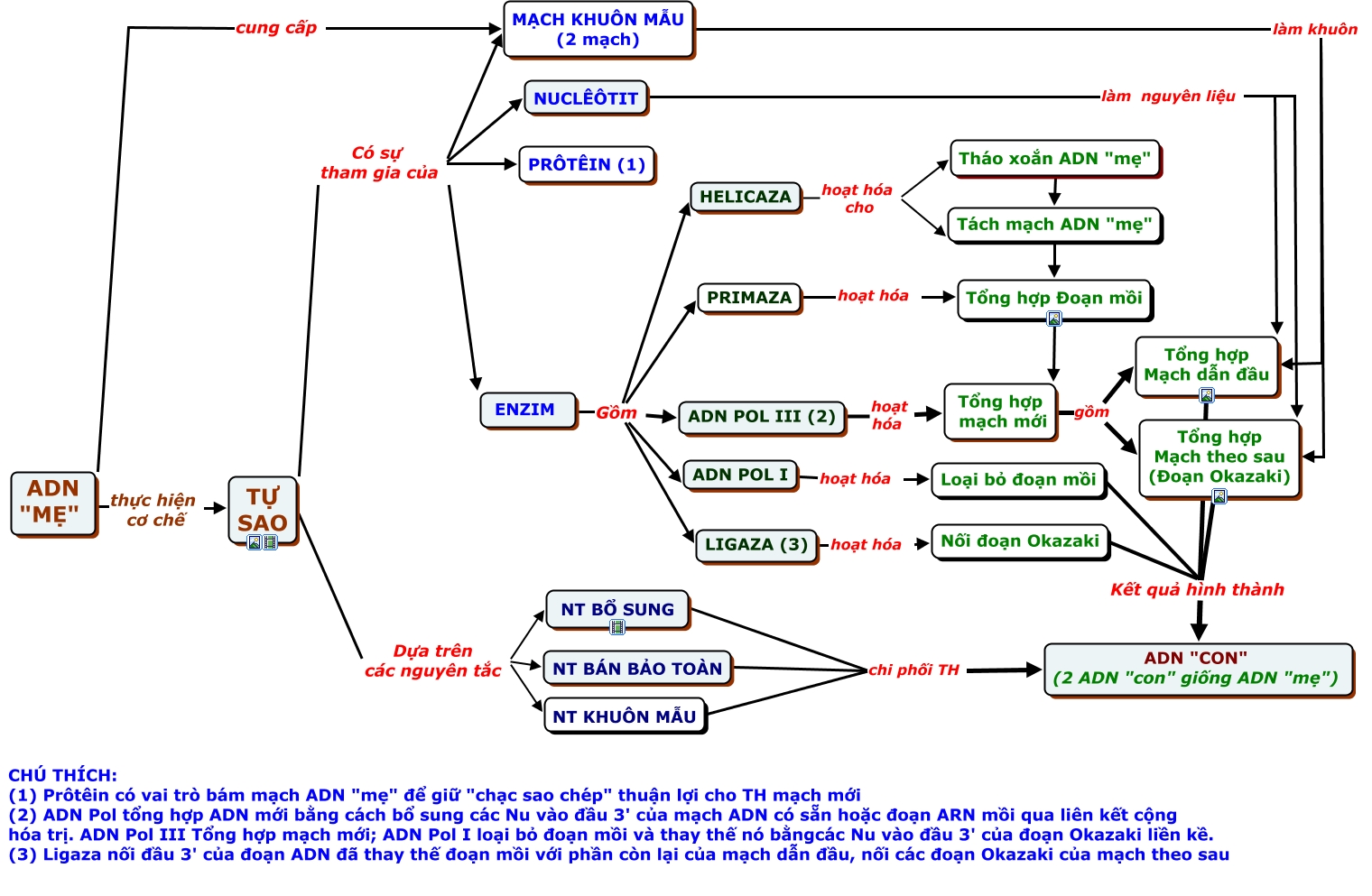This Concept Map, created with IHMC CmapTools, has information related to: Tự sao nc, ENZIM Gồm ADN POL III (2), ADN POL I hoạt hóa Loại bỏ đoạn mồi, TỰ SAO Dựa trên các nguyên tắc NT KHUÔN MẪU, ADN POL III (2) hoạt hóa Tổng hợp mạch mới, PRIMAZA hoạt hóa Tổng hợp Đoạn mồi, TỰ SAO Có sự tham gia của PRÔTÊIN (1), TỰ SAO Có sự tham gia của MẠCH KHUÔN MẪU (2 mạch), Tổng hợp mạch mới gồm Tổng hợp Mạch dẫn đầu, Tháo xoắn ADN "mẹ" Tách mạch ADN "mẹ", ENZIM Gồm PRIMAZA, ADN "MẸ" thực hiện cơ chế TỰ SAO, Tổng hợp Mạch dẫn đầu Kết quả hình thành ADN "CON" (2 ADN "con" giống ADN "mẹ"), HELICAZA hoạt hóa cho Tháo xoắn ADN "mẹ", TỰ SAO Có sự tham gia của ENZIM, Tổng hợp mạch mới gồm Tổng hợp Mạch theo sau (Đoạn Okazaki), ENZIM Gồm ADN POL I, NUCLÊÔTIT làm nguyên liệu Tổng hợp Mạch theo sau (Đoạn Okazaki), Nối đoạn Okazaki Kết quả hình thành ADN "CON" (2 ADN "con" giống ADN "mẹ"), Tổng hợp Mạch theo sau (Đoạn Okazaki) Kết quả hình thành ADN "CON" (2 ADN "con" giống ADN "mẹ"), NT BÁN BẢO TOÀN chi phối TH ADN "CON" (2 ADN "con" giống ADN "mẹ")