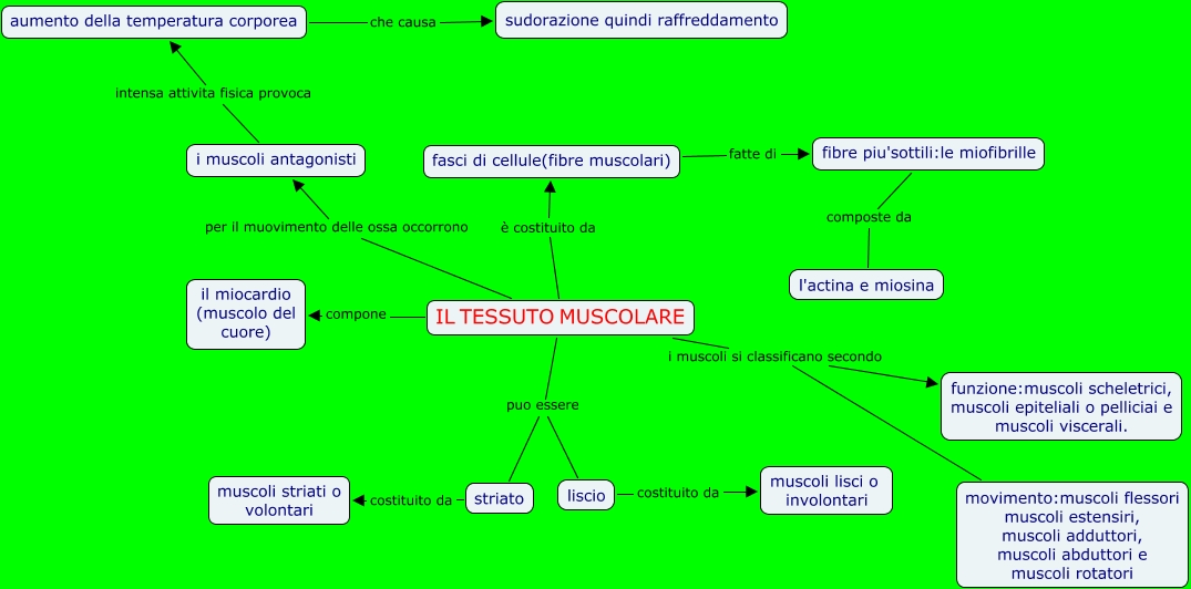 Questa Cmap, creata con IHMC CmapTools, contiene informazioni relative a: tessuto muscolare, aumento della temperatura corporea che causa sudorazione quindi raffreddamento, i muscoli antagonisti intensa attivita fisica provoca aumento della temperatura corporea, IL TESSUTO MUSCOLARE i muscoli si classificano secondo movimento:muscoli flessori muscoli estensiri, muscoli adduttori, muscoli abduttori e muscoli rotatori, IL TESSUTO MUSCOLARE per il muovimento delle ossa occorrono i muscoli antagonisti, liscio costituito da muscoli lisci o involontari, fibre piu'sottili:le miofibrille composte da l'actina e miosina, IL TESSUTO MUSCOLARE compone il miocardio (muscolo del cuore), IL TESSUTO MUSCOLARE puo essere liscio, IL TESSUTO MUSCOLARE è costituito da fasci di cellule(fibre muscolari), fasci di cellule(fibre muscolari) fatte di fibre piu'sottili:le miofibrille, striato costituito da muscoli striati o volontari, IL TESSUTO MUSCOLARE puo essere striato, IL TESSUTO MUSCOLARE i muscoli si classificano secondo funzione:muscoli scheletrici, muscoli epiteliali o pelliciai e muscoli viscerali.
