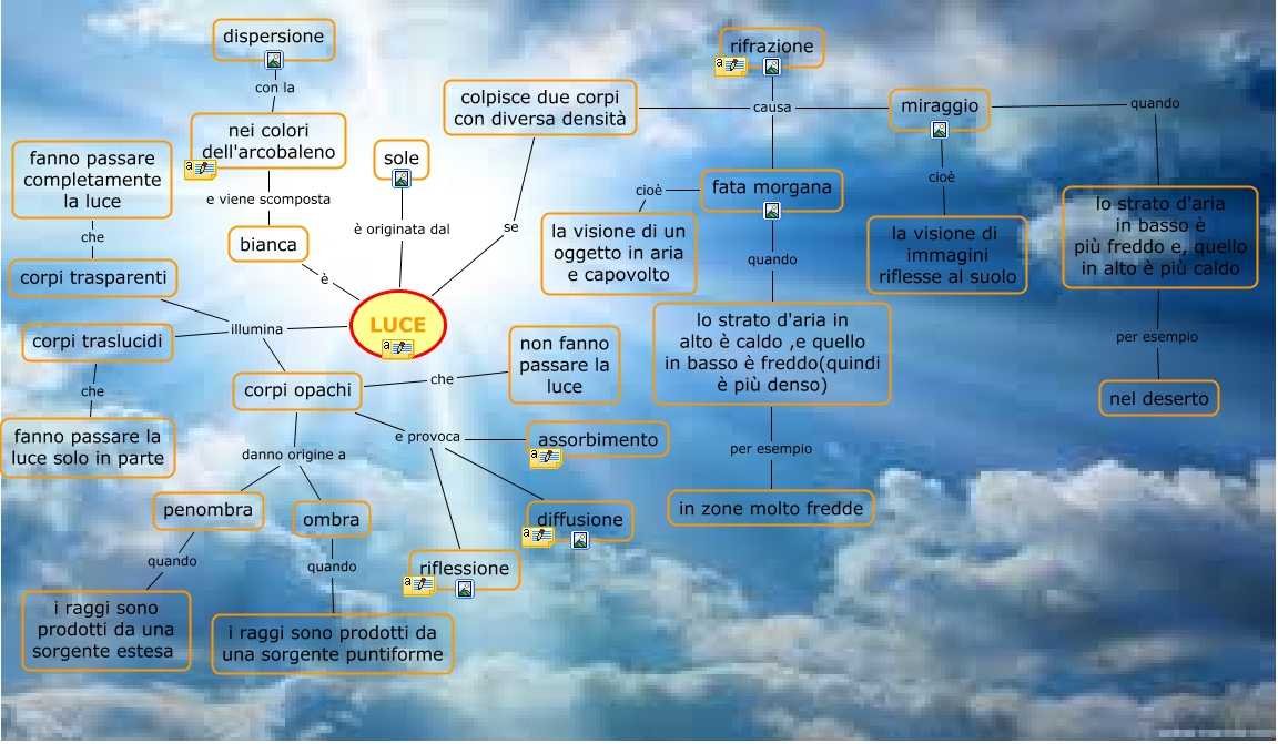 Questa Cmap, creata con IHMC CmapTools, contiene informazioni relative a: La Luce, miraggio cioè la visione di immagini riflesse al suolo, ombra quando i raggi sono prodotti da una sorgente puntiforme, colpisce due corpi con diversa densità causa fata morgana, LUCE illumina corpi traslucidi, corpi opachi e provoca diffusione, lo strato d'aria in basso è più freddo e, quello in alto è più caldo per esempio nel deserto, colpisce due corpi con diversa densità causa rifrazione, LUCE illumina corpi trasparenti, nei colori dell'arcobaleno con la dispersione, LUCE illumina corpi opachi, corpi opachi danno origine a penombra, colpisce due corpi con diversa densità causa miraggio, LUCE se colpisce due corpi con diversa densità, corpi opachi che non fanno passare la luce, LUCE è bianca, fata morgana quando lo strato d'aria in alto è caldo ,e quello in basso è freddo(quindi è più denso), fata morgana cioè la visione di un oggetto in aria e capovolto, LUCE è originata dal sole, penombra quando i raggi sono prodotti da una sorgente estesa, corpi opachi e provoca riflessione