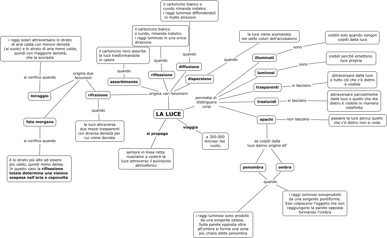 Questa Cmap, creata con IHMC CmapTools, contiene informazioni relative a: la luce, fata morgana si verifica quando è lo strato più alto ad essere più caldo, quindi meno densa. In questo caso la riflessione totale determina una visione sospesa nell'aria e capovolta, LA LUCE origina vari fenomeni dispersione, riflessione quando il cartoncino bianco e lucido, rimanda indietro i raggi luminosi in una unica direzione, penombra quando i raggi luminosi sono prodotti da una sorgente estesa. Sulla parete opposta oltre all'ombra si forma una zona più chiara detta penombra, LA LUCE origina vari fenomeni diffusione, LA LUCE permette di distinguere corpi traslucidi, LA LUCE origina vari fenomeni rifrazione, dispersione quando la luce viene scomposta nei sette colori dell'arcobaleno, LA LUCE origina vari fenomeni assorbimento, opachi non lasciano passare la luce percui quello che c'è dietro non si vede, diffusione quando il cartoncino bianco e ruvido rimanda indietro i raggi luminosi diffondendoli in molte direzioni, penombra quando i raggi luminosi sonoprodotti da una sorgente puntiforme. Essi colpiscono l'oggetto ma non raggiungono la parete opposta formando l'ombra, LA LUCE permette di distinguere corpi luminosi, opachi se colpiti dalla luce danno origine all' ombra, LA LUCE permette di distinguere corpi opachi, opachi se colpiti dalla luce danno origine all' penombra, LA LUCE origina vari fenomeni riflessione, rifrazione quando la luce attraversa due mezzi trasparenti con diversa densità per cui viene deviata, LA LUCE permette di distinguere corpi illuminati, trasparenti si lasciano attraversare dalla luce e tutto ciò che c'è dietro è visibile