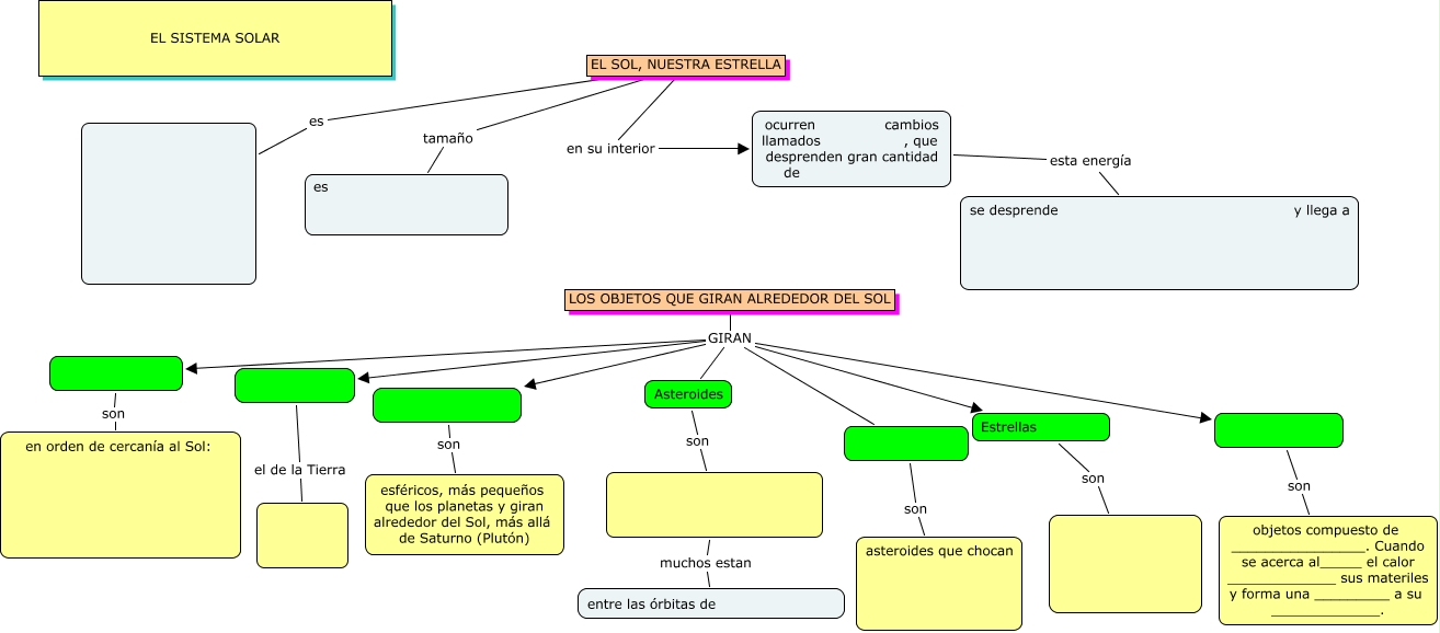 Este Cmap, tiene información relacionada con: EL SISTEMA SOLAR-MUDO, Estrellas son, LOS OBJETOS QUE GIRAN ALREDEDOR DEL SOL GIRAN, LOS OBJETOS QUE GIRAN ALREDEDOR DEL SOL GIRAN Asteroides, el de la Tierra, LOS OBJETOS QUE GIRAN ALREDEDOR DEL SOL GIRAN, son asteroides que chocan, LOS OBJETOS QUE GIRAN ALREDEDOR DEL SOL GIRAN Estrellas, son en orden de cercanía al Sol:, ocurren cambios llamados , que desprenden gran cantidad de esta energía se desprende y llega a, LOS OBJETOS QUE GIRAN ALREDEDOR DEL SOL GIRAN, son esféricos, más pequeños que los planetas y giran alrededor del Sol, más allá de Saturno (Plutón), muchos estan entre las órbitas de, LOS OBJETOS QUE GIRAN ALREDEDOR DEL SOL GIRAN, EL SOL, NUESTRA ESTRELLA tamaño es, LOS OBJETOS QUE GIRAN ALREDEDOR DEL SOL GIRAN, Asteroides son, EL SOL, NUESTRA ESTRELLA es, EL SOL, NUESTRA ESTRELLA en su interior ocurren cambios llamados , que desprenden gran cantidad de, son objetos compuesto de ________________. Cuando se acerca al_____ el calor _____________ sus materiles y forma una _________ a su _____________.