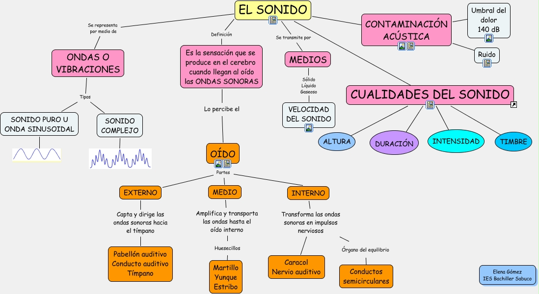 Este Cmap, tiene información relacionada con: El sonido, MEDIOS Sólido Líquido Gaseoso VELOCIDAD DEL SONIDO, MEDIO Amplifica y transporta las ondas hasta el oído interno Huesecillos, CUALIDADES DEL SONIDO ???? TIMBRE, EL SONIDO ???? CONTAMINACIÓN ACÚSTICA, CONTAMINACIÓN ACÚSTICA ???? Umbral del dolor 140 dB, CONTAMINACIÓN ACÚSTICA ???? Ruido, ONDAS O VIBRACIONES Tipos SONIDO COMPLEJO, CUALIDADES DEL SONIDO ???? ALTURA, ???? SONIDO PURO U ONDA SINUSOIDAL, Órgano del equilibrio Transforma las ondas sonoras en impulsos nerviosos Caracol Nervio auditivo, EL SONIDO ???? CUALIDADES DEL SONIDO, ONDAS O VIBRACIONES Tipos SONIDO PURO U ONDA SINUSOIDAL, EL SONIDO Se transmite por MEDIOS, EXTERNO Capta y dirige las ondas sonoras hacia el tímpano Pabellón auditivo Conducto auditivo Tímpano, OÍDO Partes EXTERNO, CUALIDADES DEL SONIDO ???? DURACIÓN, Es la sensación que se produce en el cerebro cuando llegan al oído las ONDAS SONORAS Definición EL SONIDO, Es la sensación que se produce en el cerebro cuando llegan al oído las ONDAS SONORAS Lo percibe el OÍDO, INTERNO Transforma las ondas sonoras en impulsos nerviosos Caracol Nervio auditivo, EL SONIDO Se representa por medio de ONDAS O VIBRACIONES
