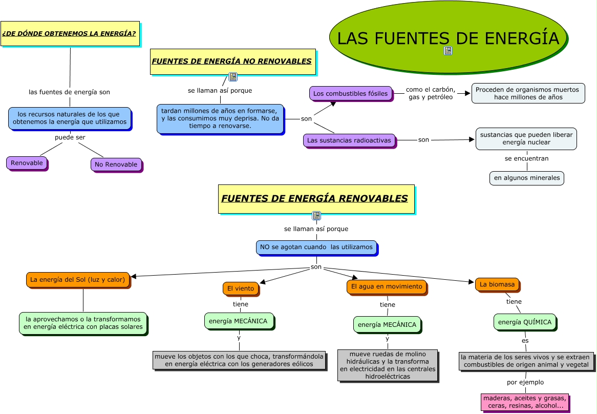 Este Cmap, tiene información relacionada con: LAS FUENTES DE ENERGÍA, La energía del Sol (luz y calor) ???? la aprovechamos o la transformamos en energía eléctrica con placas solares, la materia de los seres vivos y se extraen combustibles de origen animal y vegetal por ejemplo maderas, aceites y grasas, ceras, resinas, alcohol..., energía QUÍMICA es la materia de los seres vivos y se extraen combustibles de origen animal y vegetal, FUENTES DE ENERGÍA NO RENOVABLES se llaman así porque tardan millones de años en formarse, y las consumimos muy deprisa. No da tiempo a renovarse., Los combustibles fósiles como el carbón, gas y petróleo Proceden de organismos muertos hace millones de años, Las sustancias radioactivas son sustancias que pueden liberar energía nuclear, energía MECÁNICA y mueve los objetos con los que choca, transformándola en energía eléctrica con los generadores eólicos, sustancias que pueden liberar energía nuclear se encuentran en algunos minerales, FUENTES DE ENERGÍA RENOVABLES se llaman así porque NO se agotan cuando las utilizamos, NO se agotan cuando las utilizamos son El viento, NO se agotan cuando las utilizamos son El agua en movimiento, los recursos naturales de los que obtenemos la energía que utilizamos puede ser No Renovable, ¿DE DÓNDE OBTENEMOS LA ENERGÍA? las fuentes de energía son los recursos naturales de los que obtenemos la energía que utilizamos, tardan millones de años en formarse, y las consumimos muy deprisa. No da tiempo a renovarse. son Los combustibles fósiles, El agua en movimiento tiene energía MECÁNICA, energía MECÁNICA y mueve ruedas de molino hidráulicas y la transforma en electricidad en las centrales hidroeléctricas, El viento tiene energía MECÁNICA, NO se agotan cuando las utilizamos son La biomasa, tardan millones de años en formarse, y las consumimos muy deprisa. No da tiempo a renovarse. son Las sustancias radioactivas, NO se agotan cuando las utilizamos son La energía del Sol (luz y calor)