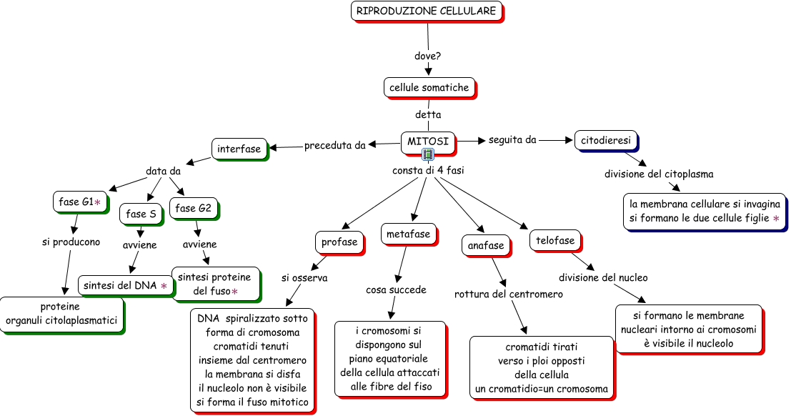 Questa Cmap, creata con IHMC CmapTools, contiene informazioni relative a: mitosi (2).cmap, telofase divisione del nucleo si formano le membrane nucleari intorno ai cromosomi è visibile il nucleolo, MITOSI consta di 4 fasi metafase, fase G1∗ si producono proteine organuli citolaplasmatici, interfase data da fase G2, MITOSI consta di 4 fasi anafase, interfase data da fase G1∗, anafase rottura del centromero cromatidi tirati verso i ploi opposti della cellula un cromatidio=un cromosoma, fase G2 avviene sintesi proteine del fuso∗, metafase cosa succede i cromosomi si dispongono sul piano equatoriale della cellula attaccati alle fibre del fiso, cellule somatiche detta MITOSI, interfase data da fase S, citodieresi divisione del citoplasma la membrana cellulare si invagina si formano le due cellule figlie ∗, MITOSI consta di 4 fasi profase, MITOSI consta di 4 fasi telofase, RIPRODUZIONE CELLULARE dove? cellule somatiche, MITOSI seguita da citodieresi, MITOSI preceduta da interfase, fase S avviene sintesi del DNA ∗, profase si osserva DNA spiralizzato sotto forma di cromosoma cromatidi tenuti insieme dal centromero la membrana si disfa il nucleolo non è visibile si forma il fuso mitotico