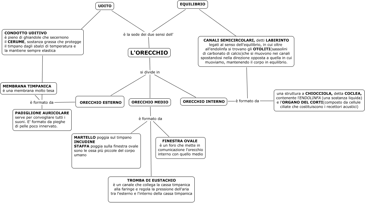 Questa Cmap, creata con IHMC CmapTools, contiene informazioni relative a: orecchio, ORECCHIO ESTERNO è formato da CONDOTTO UDITIVO è pieno di ghiandole che secernono il CERUME, sostanza grassa che protegge il timpano dagli sbalzi di temperatura e la mantiene sempre elastica, L'ORECCHIO è la sede dei due sensi dell' UDITO, L'ORECCHIO si divide in ORECCHIO ESTERNO, ORECCHIO INTERNO è formato da una struttura a CHIOCCIOLA, detta COCLEA, contenente l'ENDOLINFA(una sostanza liquida) e l'ORGANO DEL CORTI(composto da cellule ciliate che costituiscono i recettori acustici), UDITO ???? CONDOTTO UDITIVO è pieno di ghiandole che secernono il CERUME, sostanza grassa che protegge il timpano dagli sbalzi di temperatura e la mantiene sempre elastica, ORECCHIO ESTERNO è formato da PADIGLIONE AURICOLARE serve per convogliare tutti i suoni. E' formato da pieghe di pelle poco innervato., ORECCHIO MEDIO è formato da MARTELLO poggia sul timpano INCUDINE STAFFA poggia sulla finestra ovale sono le ossa più piccole del corpo umano, ORECCHIO INTERNO è formato da CANALI SEMICIRCOLARI, detti LABIRINTO legati al senso dell'equilibrio, in cui oltre all'endolinfa si trovano gli OTOLITI(sassolini di carbonato di calcio)che si muovono nei canali spostandosi nella direzione opposta a quella in cui muoviamo, mantenendo il corpo in equilibrio., ORECCHIO MEDIO è formato da TROMBA DI EUSTACHIO è un canale che collega la cassa timpanica alla faringe e regola la pressione dell'aria tra l'esterno e l'interno della cassa timpanica, L'ORECCHIO si divide in ORECCHIO INTERNO, L'ORECCHIO è la sede dei due sensi dell' EQUILIBRIO, L'ORECCHIO si divide in ORECCHIO MEDIO, ORECCHIO ESTERNO è formato da MEMBRANA TIMPANICA è una membrana molto tesa, ORECCHIO MEDIO è formato da FINESTRA OVALE è un foro che mette in comunicazione l'orecchio interno con quello medio, EQUILIBRIO ???? CANALI SEMICIRCOLARI, detti LABIRINTO legati al senso dell'equilibrio, in cui oltre all'endolinfa si trovano gli OTOLITI(sassolini di carbonato di calcio)che si muovono nei canali spostandosi nella direzione opposta a quella in cui muoviamo, mantenendo il corpo in equilibrio.