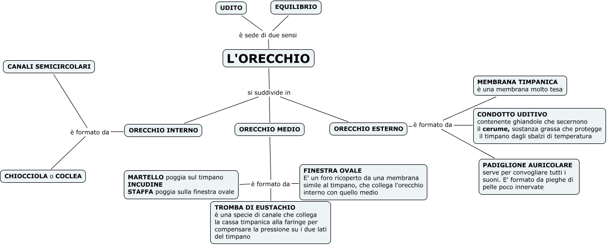 Questa Cmap, creata con IHMC CmapTools, contiene informazioni relative a: orecchio, L'ORECCHIO si suddivide in ORECCHIO MEDIO, L'ORECCHIO è sede di due sensi UDITO, L'ORECCHIO è sede di due sensi EQUILIBRIO, ORECCHIO INTERNO è formato da CANALI SEMICIRCOLARI, ORECCHIO MEDIO è formato da TROMBA DI EUSTACHIO è una specie di canale che collega la cassa timpanica alla faringe per compensare la pressione su i due lati del timpano, L'ORECCHIO si suddivide in ORECCHIO ESTERNO, ORECCHIO ESTERNO è formato da CONDOTTO UDITIVO contenente ghiandole che secernono il cerume, sostanza grassa che protegge il timpano dagli sbalzi di temperatura, ORECCHIO ESTERNO è formato da MEMBRANA TIMPANICA è una membrana molto tesa, ORECCHIO MEDIO è formato da FINESTRA OVALE E' un foro ricoperto da una membrana simile al timpano, che collega l'orecchio interno con quello medio, ORECCHIO ESTERNO è formato da PADIGLIONE AURICOLARE serve per convogliare tutti i suoni. E' formato da pieghe di pelle poco innervate, L'ORECCHIO si suddivide in ORECCHIO INTERNO, ORECCHIO INTERNO è formato da CHIOCCIOLA o COCLEA, ORECCHIO MEDIO è formato da MARTELLO poggia sul timpano INCUDINE STAFFA poggia sulla finestra ovale