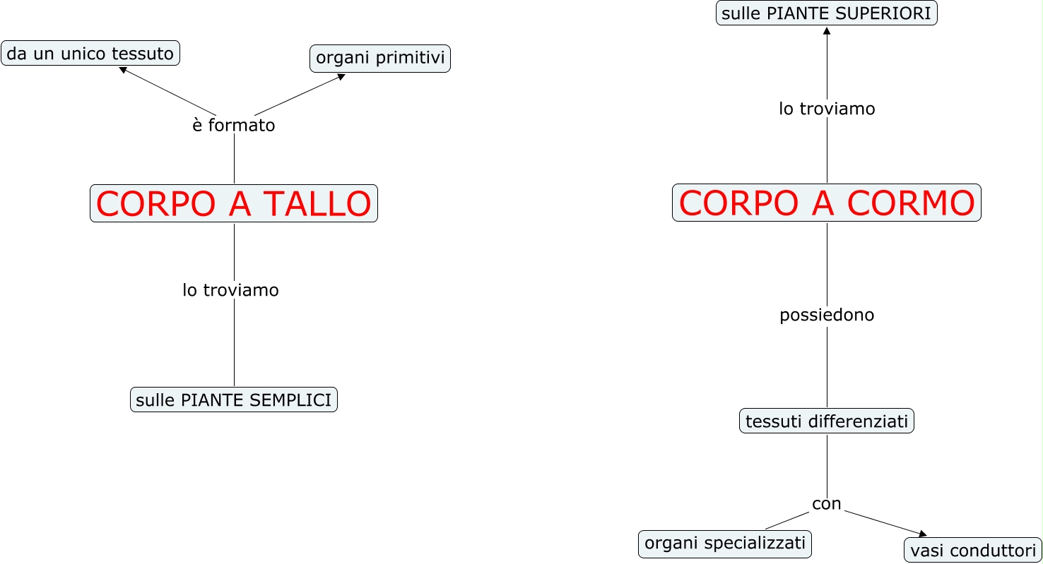 Questa Cmap, creata con IHMC CmapTools, contiene informazioni relative a: corpo a tallo e a cormo, tessuti differenziati con vasi conduttori, CORPO A CORMO lo troviamo sulle PIANTE SUPERIORI, tessuti differenziati con organi specializzati, CORPO A TALLO lo troviamo sulle PIANTE SEMPLICI, CORPO A CORMO possiedono tessuti differenziati, CORPO A TALLO è formato da un unico tessuto, CORPO A TALLO è formato organi primitivi