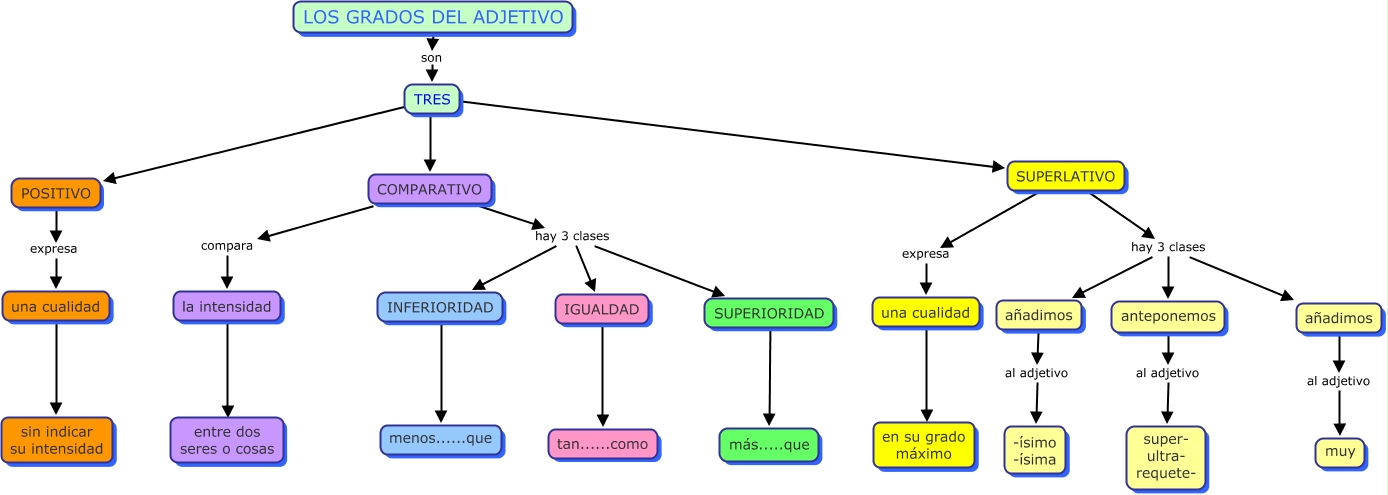 Este Cmap, tiene información relacionada con: TEMA 5 GRADOS DEL ADJETIVO, COMPARATIVO hay 3 clases SUPERIORIDAD, añadimos al adjetivo muy, una cualidad sin indicar sin indicar su intensidad, COMPARATIVO compara la intensidad, una cualidad en su grado en su grado máximo, TRES ???? SUPERLATIVO, IGUALDAD ???? tan......como, SUPERLATIVO hay 3 clases añadimos, TRES ???? COMPARATIVO, COMPARATIVO hay 3 clases INFERIORIDAD, POSITIVO expresa una cualidad, SUPERIORIDAD ???? más.....que, SUPERLATIVO hay 3 clases añadimos, TRES ???? POSITIVO, anteponemos al adjetivo super- ultra- requete-, SUPERLATIVO hay 3 clases anteponemos, INFERIORIDAD ???? menos......que, COMPARATIVO hay 3 clases IGUALDAD, SUPERLATIVO expresa una cualidad, LOS GRADOS DEL ADJETIVO son TRES