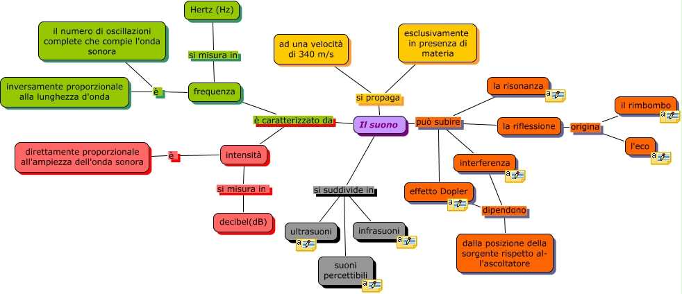 Questa Cmap, creata con IHMC CmapTools, contiene informazioni relative a: il suono, Il suono si suddivide in suoni percettibili, Il suono si propaga esclusivamente in presenza di materia, Il suono è caratterizzato da frequenza, intensità si misura in decibel(dB), interferenza dipendono dalla posizione della sorgente rispetto al- l'ascoltatore, frequenza è inversamente proporzionale alla lunghezza d'onda, Il suono è caratterizzato da intensità, Il suono si suddivide in ultrasuoni, Il suono può subire la riflessione, effetto Dopler dipendono dalla posizione della sorgente rispetto al- l'ascoltatore, Il suono può subire la risonanza, Il suono si suddivide in infrasuoni, frequenza è il numero di oscillazioni complete che compie l'onda sonora, la riflessione origina il rimbombo, la riflessione origina l'eco, Il suono si propaga ad una velocità di 340 m/s, Il suono può subire effetto Dopler, Il suono può subire interferenza, frequenza si misura in Hertz (Hz), intensità è direttamente proporzionale all'ampiezza dell'onda sonora