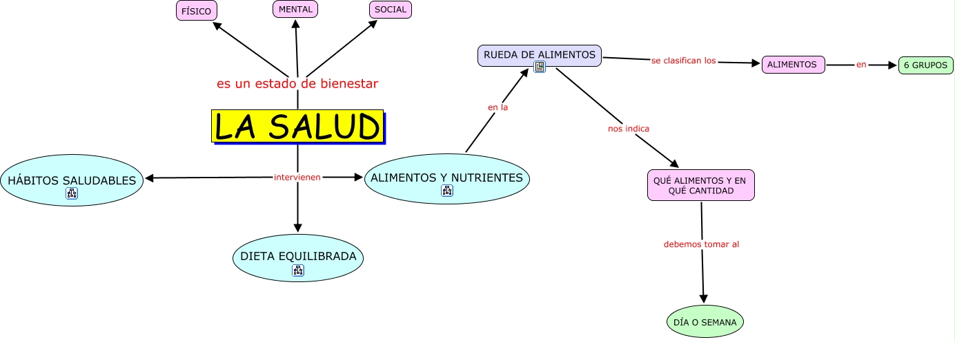 Este Cmap, tiene información relacionada con: SALUD 4º PRIMARIA, QUÉ ALIMENTOS Y EN QUÉ CANTIDAD debemos tomar al D�?A O SEMANA, LA SALUD es un estado de bienestar SOCIAL, LA SALUD intervienen H�?BITOS SALUDABLES, LA SALUD intervienen ALIMENTOS Y NUTRIENTES, LA SALUD es un estado de bienestar MENTAL, RUEDA DE ALIMENTOS se clasifican los ALIMENTOS, LA SALUD intervienen DIETA EQUILIBRADA, LA SALUD es un estado de bienestar F�?SICO, ALIMENTOS Y NUTRIENTES en la RUEDA DE ALIMENTOS, RUEDA DE ALIMENTOS nos indica QUÉ ALIMENTOS Y EN QUÉ CANTIDAD, ALIMENTOS en 6 GRUPOS