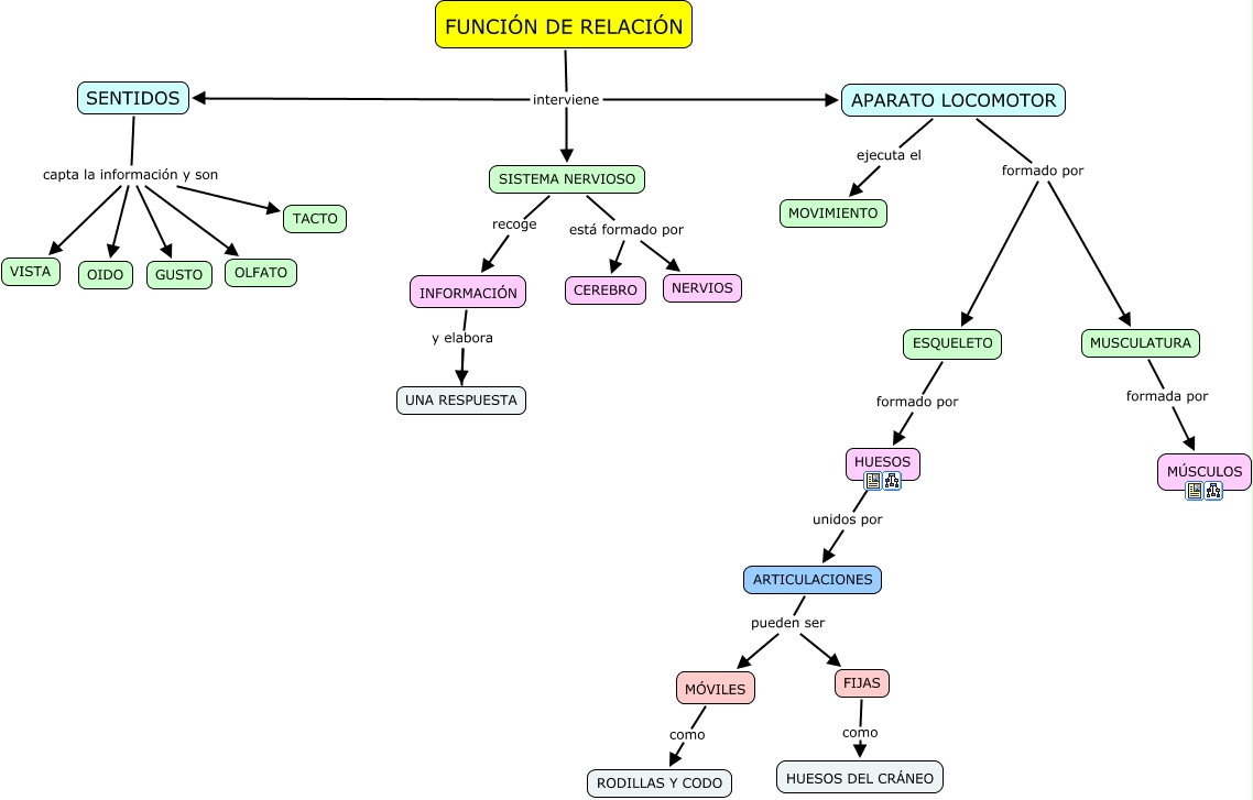 Este Cmap, tiene información relacionada con: FUNCIÓN DE RELACIÓN 4º PRIMARIA, ARTICULACIONES pueden ser MÓVILES, SISTEMA NERVIOSO está formado por NERVIOS, SENTIDOS capta la información y son GUSTO, FIJAS como HUESOS DEL CR�?NEO, FUNCIÓN DE RELACIÓN interviene SISTEMA NERVIOSO, FUNCIÓN DE RELACIÓN interviene SENTIDOS, MUSCULATURA formada por MÚSCULOS, SISTEMA NERVIOSO recoge INFORMACIÓN, APARATO LOCOMOTOR ejecuta el MOVIMIENTO, SISTEMA NERVIOSO está formado por CEREBRO, APARATO LOCOMOTOR formado por MUSCULATURA, INFORMACIÓN y elabora UNA RESPUESTA, SENTIDOS capta la información y son OLFATO, APARATO LOCOMOTOR formado por ESQUELETO, HUESOS unidos por ARTICULACIONES, ARTICULACIONES pueden ser FIJAS, FUNCIÓN DE RELACIÓN interviene APARATO LOCOMOTOR, ESQUELETO formado por HUESOS, SENTIDOS capta la información y son VISTA, MÓVILES como RODILLAS Y CODO