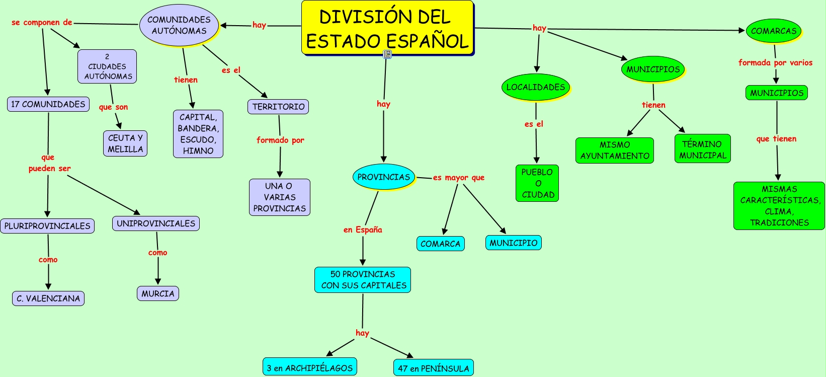 Este Cmap, tiene información relacionada con: DIVISIÓN DEL ESTADO ESPAÑOL, DIVISIÓN DEL ESTADO ESPAÑOL hay PROVINCIAS, COMUNIDADES AUTÓNOMAS tienen CAPITAL, BANDERA, ESCUDO, HIMNO, 2 CIUDADES AUTÓNOMAS que son CEUTA Y MELILLA, MUNICIPIOS tienen TÉRMINO MUNICIPAL, 17 COMUNIDADES que pueden ser PLURIPROVINCIALES, 50 PROVINCIAS CON SUS CAPITALES hay 47 en PEN�?NSULA, 50 PROVINCIAS CON SUS CAPITALES hay 3 en ARCHIPIÉLAGOS, PLURIPROVINCIALES como C. VALENCIANA, COMARCAS formada por varios MUNICIPIOS, DIVISIÓN DEL ESTADO ESPAÑOL hay COMUNIDADES AUTÓNOMAS, PROVINCIAS en España 50 PROVINCIAS CON SUS CAPITALES, DIVISIÓN DEL ESTADO ESPAÑOL hay MUNICIPIOS, DIVISIÓN DEL ESTADO ESPAÑOL hay COMARCAS, PROVINCIAS es mayor que COMARCA, DIVISIÓN DEL ESTADO ESPAÑOL hay LOCALIDADES, COMUNIDADES AUTÓNOMAS es el TERRITORIO, TERRITORIO formado por UNA O VARIAS PROVINCIAS, MUNICIPIOS que tienen MISMAS CARACTER�?STICAS, CLIMA, TRADICIONES, UNIPROVINCIALES como MURCIA, 17 COMUNIDADES que pueden ser UNIPROVINCIALES