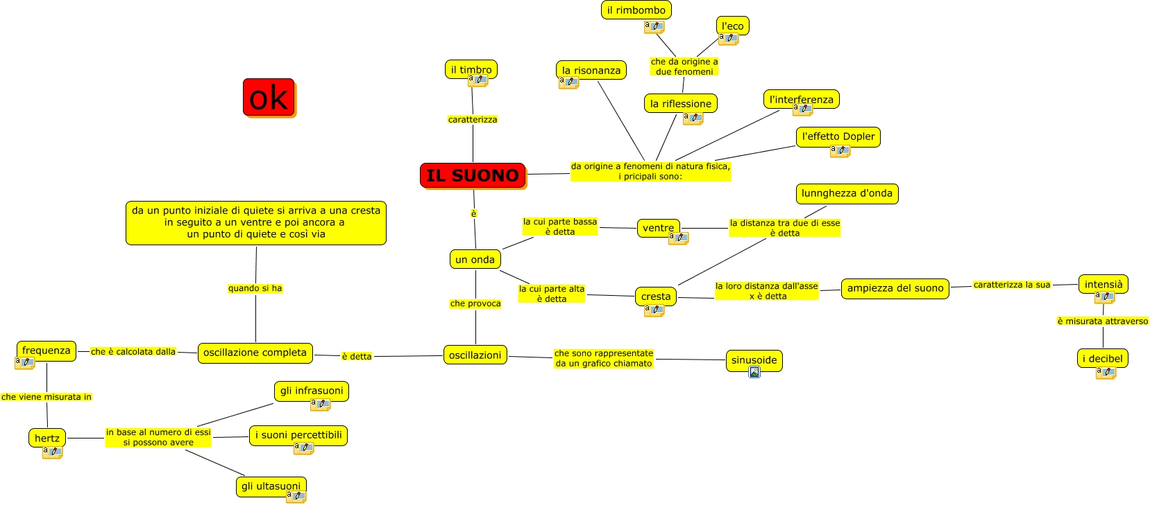 Questa Cmap, creata con IHMC CmapTools, contiene informazioni relative a: il suono, IL SUONO da origine a fenomeni di natura fisica, i pricipali sono: l'interferenza, oscillazioni che sono rappresentate da un grafico chiamato sinusoide, oscillazioni è detta oscillazione completa, hertz in base al numero di essi si possono avere gli ultasuoni, IL SUONO da origine a fenomeni di natura fisica, i pricipali sono: la riflessione, un onda la cui parte bassa è detta ventre, un onda la cui parte alta è detta cresta, oscillazione completa che è calcolata dalla frequenza, frequenza che viene misurata in hertz, ampiezza del suono caratterizza la sua intensià, IL SUONO da origine a fenomeni di natura fisica, i pricipali sono: l'effetto Dopler, hertz in base al numero di essi si possono avere gli infrasuoni, un onda che provoca oscillazioni, la riflessione che da origine a due fenomeni il rimbombo, hertz in base al numero di essi si possono avere i suoni percettibili, IL SUONO caratterizza il timbro, la riflessione che da origine a due fenomeni l'eco, IL SUONO è un onda, intensià è misurata attraverso i decibel, IL SUONO da origine a fenomeni di natura fisica, i pricipali sono: la risonanza