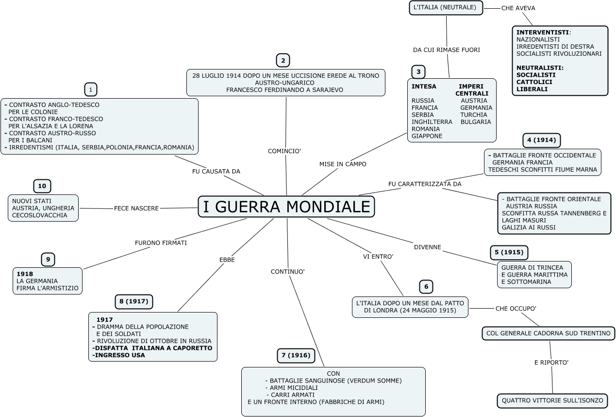 Questa Cmap, creata con IHMC CmapTools, contiene informazioni relative a: I GUERRA MONDIALE, I GUERRA MONDIALE EBBE 1917 - DRAMMA DELLA POPOLAZIONE E DEI SOLDATI - RIVOLUZIONE DI OTTOBRE IN RUSSIA -DISFATTA ITALIANA A CAPORETTO -INGRESSO USA, I GUERRA MONDIALE MISE IN CAMPO INTESA IMPERI CENTRALI RUSSIA AUSTRIA FRANCIA GERMANIA SERBIA TURCHIA INGHILTERRA BULGARIA ROMANIA GIAPPONE, COL GENERALE CADORNA SUD TRENTINO E RIPORTO' QUATTRO VITTORIE SULL'ISONZO, I GUERRA MONDIALE CONTINUO' CON - BATTAGLIE SANGUINOSE (VERDUM SOMME) - ARMI MICIDIALI - CARRI ARMATI E UN FRONTE INTERNO (FABBRICHE DI ARMI), I GUERRA MONDIALE DIVENNE GUERRA DI TRINCEA E GUERRA MARITTIMA E SOTTOMARINA, I GUERRA MONDIALE FECE NASCERE NUOVI STATI AUSTRIA, UNGHERIA CECOSLOVACCHIA, INTESA IMPERI CENTRALI RUSSIA AUSTRIA FRANCIA GERMANIA SERBIA TURCHIA INGHILTERRA BULGARIA ROMANIA GIAPPONE DA CUI RIMASE FUORI L'ITALIA (NEUTRALE), I GUERRA MONDIALE FU CARATTERIZZATA DA - BATTAGLIE FRONTE OCCIDENTALE GERMANIA FRANCIA TEDESCHI SCONFITTI FIUME MARNA, I GUERRA MONDIALE FURONO FIRMATI 1918 LA GERMANIA FIRMA L'ARMISTIZIO, I GUERRA MONDIALE COMINCIO' 28 LUGLIO 1914 DOPO UN MESE UCCISIONE EREDE AL TRONO AUSTRO-UNGARICO FRANCESCO FERDINANDO A SARAJEVO, I GUERRA MONDIALE FU CAUSATA DA - CONTRASTO ANGLO-TEDESCO PER LE COLONIE - CONTRASTO FRANCO-TEDESCO PER L'ALSAZIA E LA LORENA - CONTRASTO AUSTRO-RUSSO PER I BALCANI - IRREDENTISMI (ITALIA, SERBIA,POLONIA,FRANCIA,ROMANIA), I GUERRA MONDIALE VI ENTRO' L'ITALIA DOPO UN MESE DAL PATTO DI LONDRA (24 MAGGIO 1915), L'ITALIA (NEUTRALE) CHE AVEVA INTERVENTISTI: NAZIONALISTI IRREDENTISTI DI DESTRA SOCIALISTI RIVOLUZIONARI NEUTRALISTI: SOCIALISTI CATTOLICI LIBERALI, L'ITALIA DOPO UN MESE DAL PATTO DI LONDRA (24 MAGGIO 1915) CHE OCCUPO' COL GENERALE CADORNA SUD TRENTINO, I GUERRA MONDIALE FU CARATTERIZZATA DA - BATTAGLIE FRONTE ORIENTALE AUSTRIA RUSSIA SCONFITTA RUSSA TANNENBERG E LAGHI MASURI GALIZIA AI RUSSI