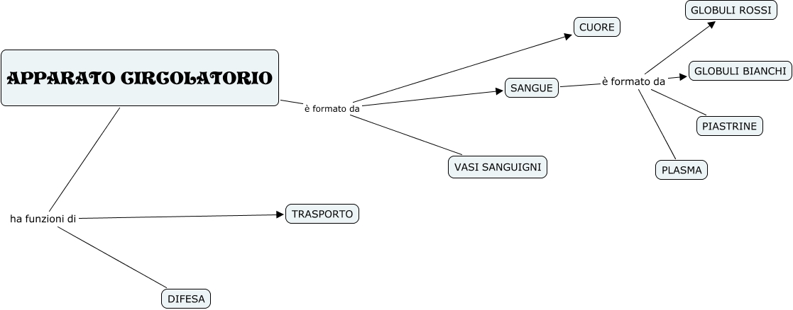 Questa Cmap, creata con IHMC CmapTools, contiene informazioni relative a: Apparato circolatorio, APPARATO CIRCOLATORIO è formato da CUORE, SANGUE è formato da PLASMA, SANGUE è formato da PIASTRINE, SANGUE è formato da GLOBULI BIANCHI, APPARATO CIRCOLATORIO è formato da SANGUE, SANGUE è formato da GLOBULI ROSSI, APPARATO CIRCOLATORIO è formato da VASI SANGUIGNI, APPARATO CIRCOLATORIO ha funzioni di TRASPORTO, APPARATO CIRCOLATORIO ha funzioni di DIFESA