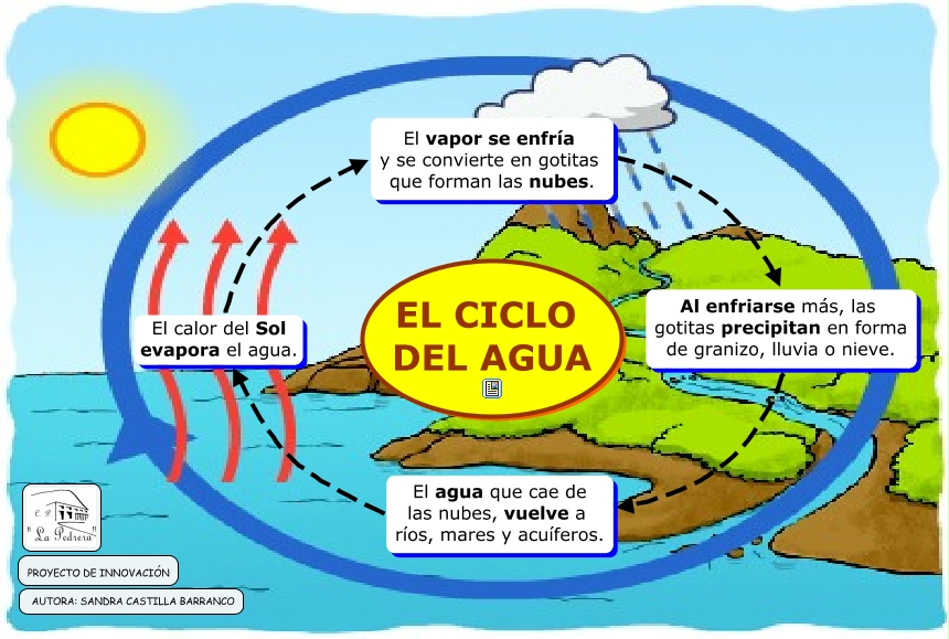 Este Cmap, tiene información relacionada con: EL CICLO DEL AGUA, El agua que cae de las nubes, vuelve a ríos, mares y acuíferos. El calor del Sol evapora el agua. El vapor se enfría y se convierte en gotitas que forman las nubes.