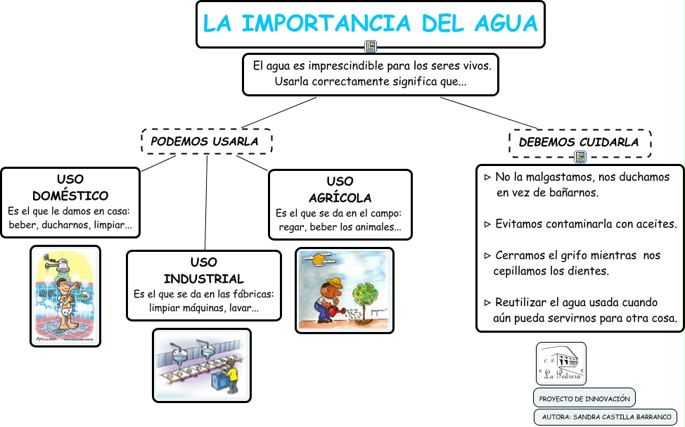 Este Cmap, tiene información relacionada con: USOS Y CUIDADOS DEL AGUA, El agua es imprescindible para los seres vivos. Usarla correctamente significa que... PODEMOS USARLA USO DOMÉSTICO Es el que le damos en casa: beber, ducharnos, limpiar..., El agua es imprescindible para los seres vivos. Usarla correctamente significa que... PODEMOS USARLA USO INDUSTRIAL Es el que se da en las fábricas: limpiar máquinas, lavar..., El agua es imprescindible para los seres vivos. Usarla correctamente significa que... PODEMOS USARLA USO AGRÍCOLA Es el que se da en el campo: regar, beber los animales..., El agua es imprescindible para los seres vivos. Usarla correctamente significa que... DEBEMOS CUIDARLA ⊳ No la malgastamos, nos duchamos en vez de bañarnos. ⊳ Evitamos contaminarla con aceites. ⊳ Cerramos el grifo mientras nos cepillamos los dientes. ⊳ Reutilizar el agua usada cuando aún pueda servirnos para otra cosa., El agua es imprescindible para los seres vivos. Usarla correctamente significa que... ???? LA IMPORTANCIA DEL AGUA