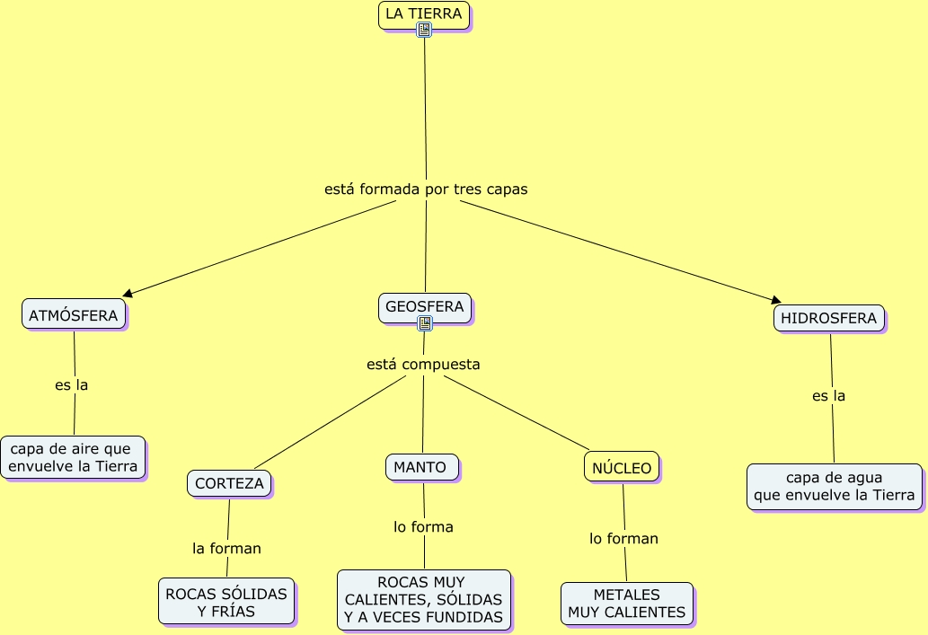 Este Cmap, tiene información relacionada con: la tierra, GEOSFERA está compuesta CORTEZA, GEOSFERA está compuesta NÚCLEO, HIDROSFERA es la capa de agua que envuelve la Tierra, LA TIERRA está formada por tres capas HIDROSFERA, ATMÓSFERA es la capa de aire que envuelve la Tierra, CORTEZA la forman ROCAS SÓLIDAS Y FRÍAS, MANTO lo forma ROCAS MUY CALIENTES, SÓLIDAS Y A VECES FUNDIDAS, NÚCLEO lo forman METALES MUY CALIENTES, LA TIERRA está formada por tres capas GEOSFERA, LA TIERRA está formada por tres capas ATMÓSFERA, GEOSFERA está compuesta MANTO