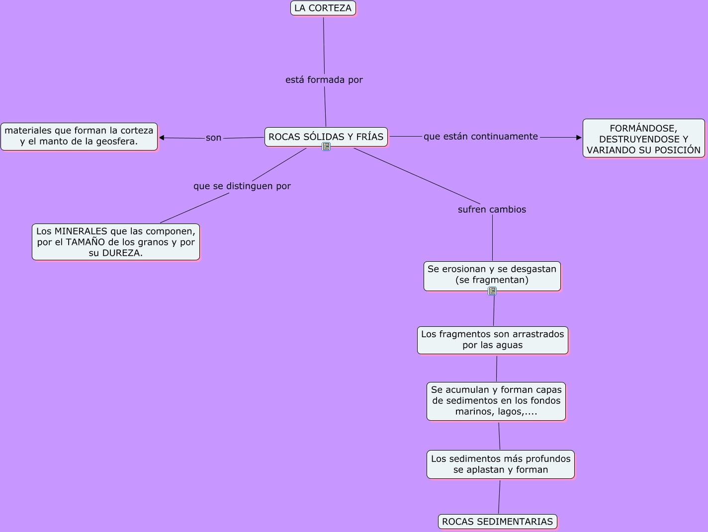 Este Cmap, tiene información relacionada con: la corteza, Los sedimentos más profundos se aplastan y forman ???? ROCAS SEDIMENTARIAS, Los fragmentos son arrastrados por las aguas ???? Se acumulan y forman capas de sedimentos en los fondos marinos, lagos,...., LA CORTEZA está formada por ROCAS SÓLIDAS Y FRÍAS, Se erosionan y se desgastan (se fragmentan) ???? Los fragmentos son arrastrados por las aguas, Se acumulan y forman capas de sedimentos en los fondos marinos, lagos,.... ???? Los sedimentos más profundos se aplastan y forman, ROCAS SÓLIDAS Y FRÍAS que se distinguen por Los MINERALES que las componen, por el TAMAÑO de los granos y por su DUREZA., ROCAS SÓLIDAS Y FRÍAS sufren cambios Se erosionan y se desgastan (se fragmentan), ROCAS SÓLIDAS Y FRÍAS que están continuamente FORMÁNDOSE, DESTRUYENDOSE Y VARIANDO SU POSICIÓN, ROCAS SÓLIDAS Y FRÍAS son materiales que forman la corteza y el manto de la geosfera.
