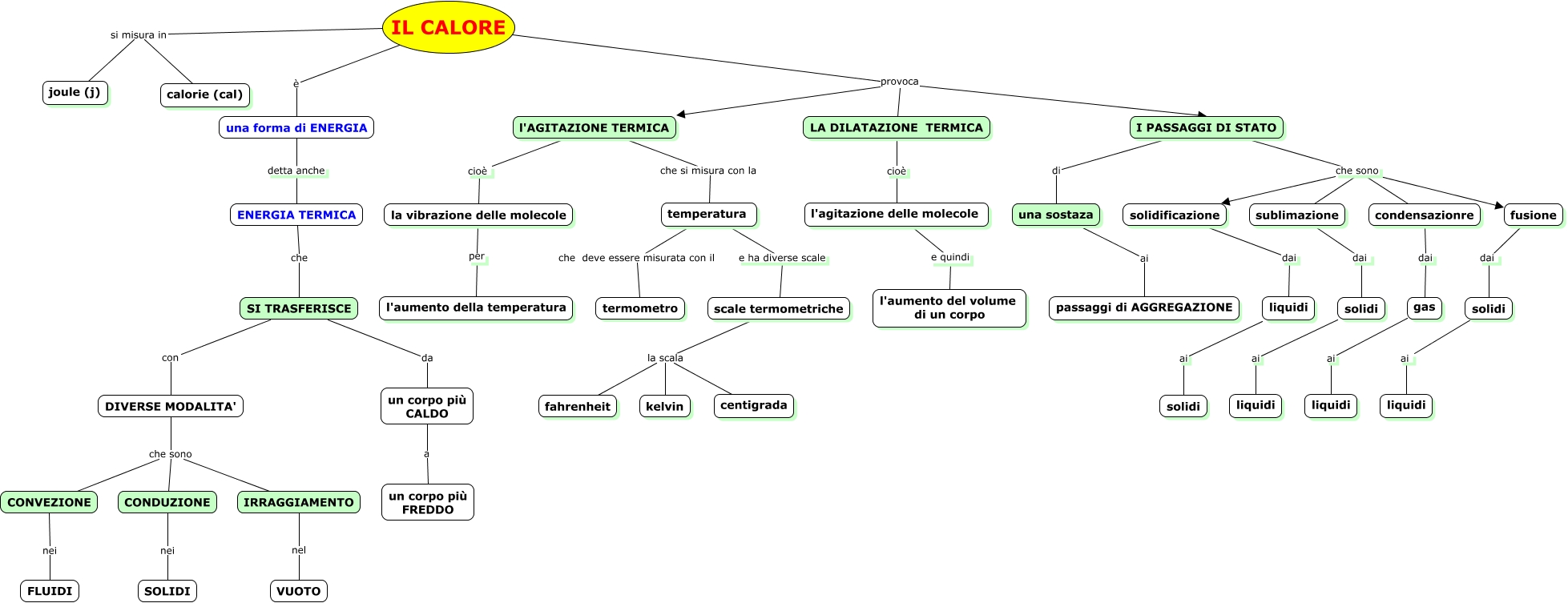 Questa Cmap, creata con IHMC CmapTools, contiene informazioni relative a: IL CALORE, IRRAGGIAMENTO nel VUOTO, fusione dai solidi, l'AGITAZIONE TERMICA cioè la vibrazione delle molecole, IL CALORE provoca l'AGITAZIONE TERMICA, CONDUZIONE nei SOLIDI, l'AGITAZIONE TERMICA che si misura con la temperatura, liquidi ai solidi, temperatura e ha diverse scale scale termometriche, la vibrazione delle molecole per l'aumento della temperatura, I PASSAGGI DI STATO che sono fusione, solidi ai liquidi, DIVERSE MODALITA' che sono CONDUZIONE, I PASSAGGI DI STATO di una sostaza, IL CALORE provoca I PASSAGGI DI STATO, scale termometriche la scala kelvin, DIVERSE MODALITA' che sono IRRAGGIAMENTO, solidificazione dai liquidi, l'agitazione delle molecole e quindi l'aumento del volume di un corpo, temperatura che deve essere misurata con il termometro, SI TRASFERISCE da un corpo più CALDO