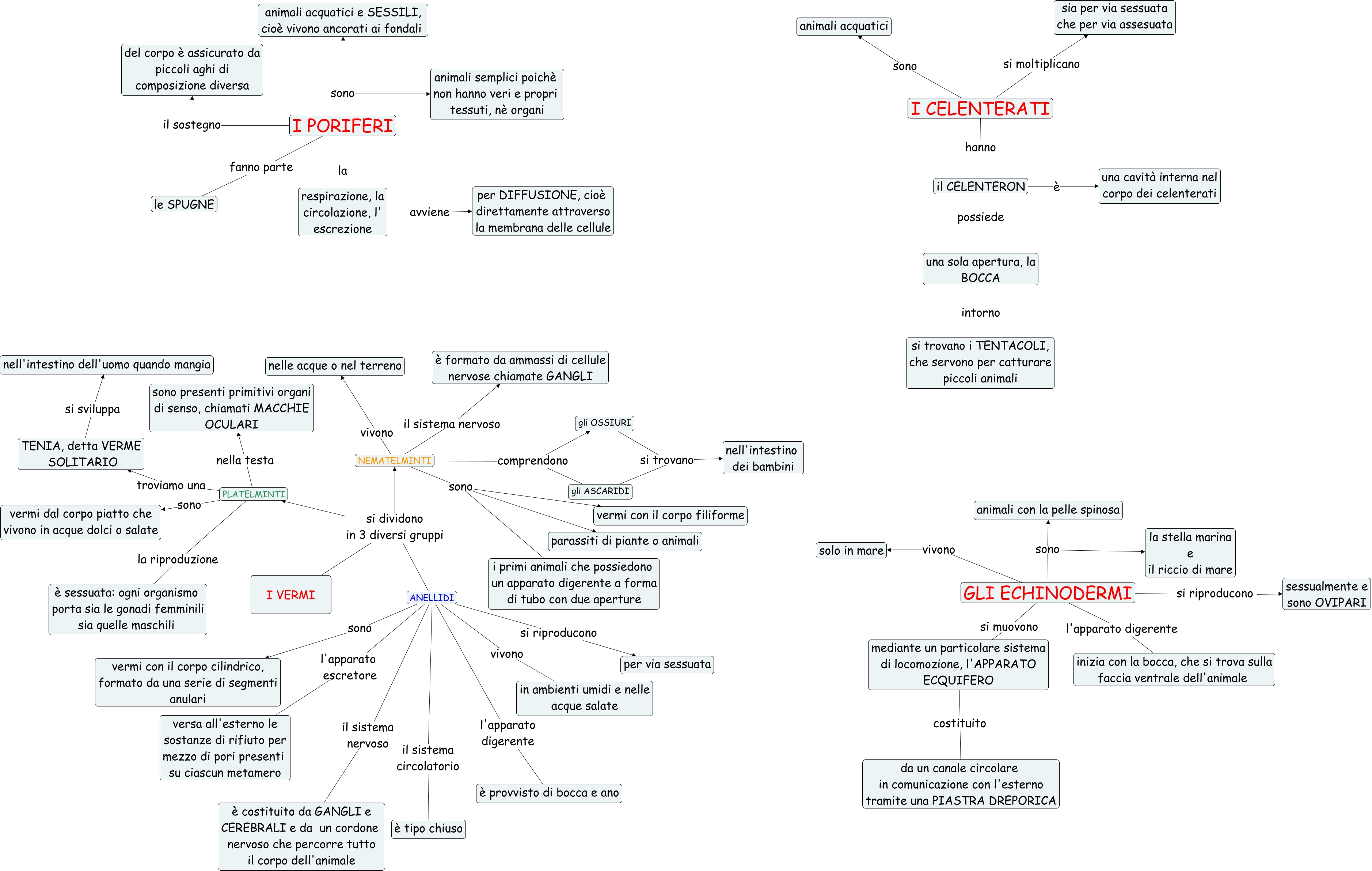 Questa Cmap, creata con IHMC CmapTools, contiene informazioni relative a: i poriferi, i celenterati, i vermi e gli echinodermi, una sola apertura, la BOCCA intorno si trovano i TENTACOLI, che servono per catturare piccoli animali, I CELENTERATI sono animali acquatici, ANELLIDI il sistema circolatorio è tipo chiuso, TENIA, detta VERME SOLITARIO si sviluppa nell'intestino dell'uomo quando mangia, PLATELMINTI sono vermi dal corpo piatto che vivono in acque dolci o salate, I VERMI si dividono in 3 diversi gruppi NEMATELMINTI, NEMATELMINTI comprendono gli ASCARIDI, ANELLIDI sono vermi con il corpo cilindrico, formato da una serie di segmenti anulari, GLI ECHINODERMI sono la stella marina e il riccio di mare, ANELLIDI l'apparato escretore versa all'esterno le sostanze di rifiuto per mezzo di pori presenti su ciascun metamero, I PORIFERI il sostegno del corpo è assicurato da piccoli aghi di composizione diversa, GLI ECHINODERMI vivono solo in mare, il CELENTERON è una cavità interna nel corpo dei celenterati, NEMATELMINTI vivono nelle acque o nel terreno, GLI ECHINODERMI si riproducono sessualmente e sono OVIPARI, I PORIFERI sono animali semplici poichè non hanno veri e propri tessuti, nè organi, I CELENTERATI si moltiplicano sia per via sessuata che per via assesuata, I VERMI si dividono in 3 diversi gruppi ANELLIDI, GLI ECHINODERMI l'apparato digerente inizia con la bocca, che si trova sulla faccia ventrale dell'animale, I PORIFERI fanno parte le SPUGNE