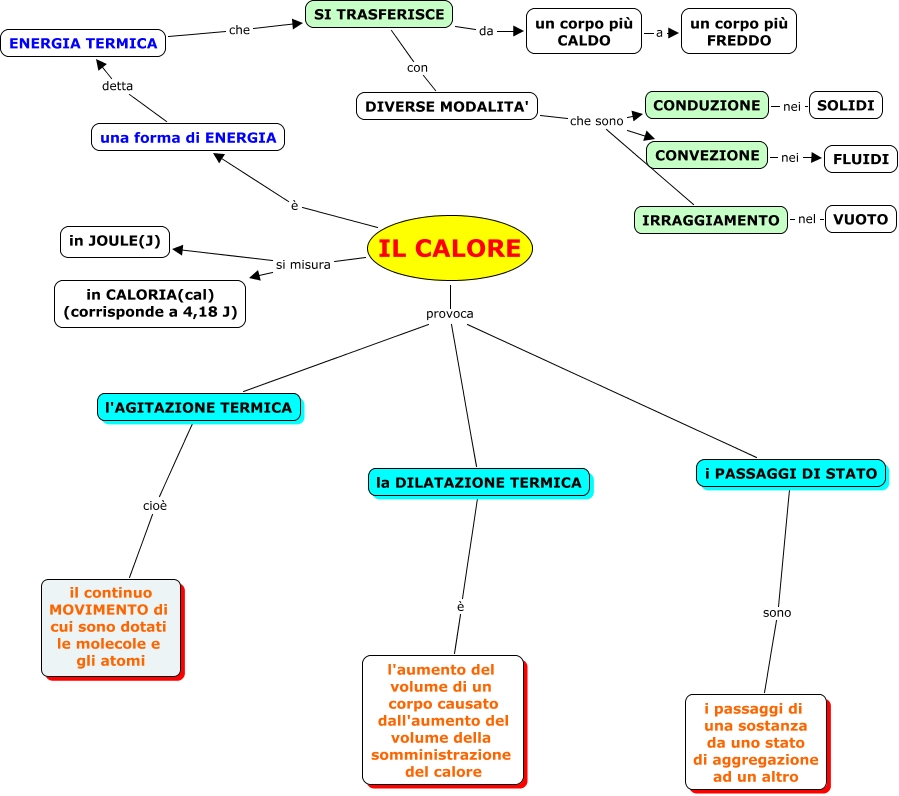 Questa Cmap, creata con IHMC CmapTools, contiene informazioni relative a: IL CALORE, SI TRASFERISCE da un corpo più CALDO, una forma di ENERGIA detta ENERGIA TERMICA, l'AGITAZIONE TERMICA cioè il continuo MOVIMENTO di cui sono dotati le molecole e gli atomi, ENERGIA TERMICA che SI TRASFERISCE, DIVERSE MODALITA' che sono CONVEZIONE, IL CALORE è una forma di ENERGIA, IL CALORE provoca l'AGITAZIONE TERMICA, un corpo più CALDO a un corpo più FREDDO, i PASSAGGI DI STATO sono i passaggi di una sostanza da uno stato di aggregazione ad un altro, IRRAGGIAMENTO nel VUOTO, IL CALORE si misura in JOULE(J), CONDUZIONE nei SOLIDI, SI TRASFERISCE con DIVERSE MODALITA', la DILATAZIONE TERMICA è l'aumento del volume di un corpo causato dall'aumento del volume della somministrazione del calore, IL CALORE provoca la DILATAZIONE TERMICA, CONVEZIONE nei FLUIDI, DIVERSE MODALITA' che sono IRRAGGIAMENTO, IL CALORE si misura in CALORIA(cal) (corrisponde a 4,18 J), IL CALORE provoca i PASSAGGI DI STATO, DIVERSE MODALITA' che sono CONDUZIONE